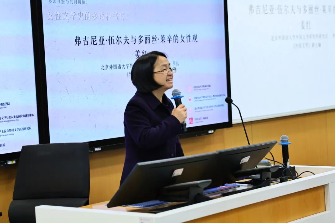 Jiang Hong, Director of Research Institute of Foreign Literature of Beijing Foreign Studies University and Associate Editor of Editorial Department of Foreign Literature, made a report on “The Feminine Values of Virginia Woolf and Doris Lessing”. From the perspectives of gender consciousness, narrative strategies, and intellectual legacy, she conducted an in-depth examination of the spiritual continuity in female self-identity and modern literary innovation between two British writers.