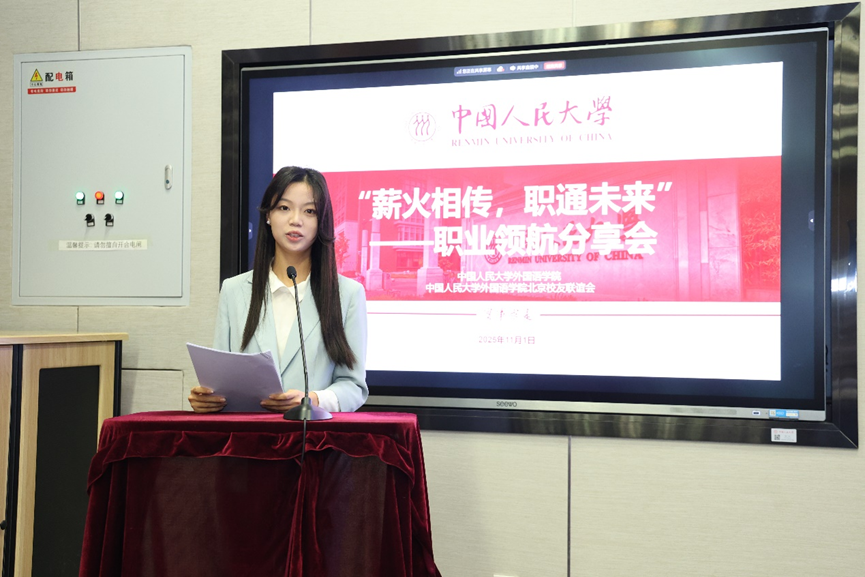 On November 1, the 3rd "Passing the Torch, Connecting Career Futures" Career Guidance Conference was held at Public Teaching Building 1 in RUC. Attending the event were Zhenyun Li, Secretary of the Party Committee of the School of Foreign Languages; Chao Bu, Deputy Director of the Admissions and Employment Office; Lanlan Chen, Deputy Secretary-General of the Alumni Services and Resource Development Department and the Education Foundation; Lili Tian, Vice Dean of the School of Foreign Languages; Yuan Lin, Deputy Secretary of the Party Committee; representatives from various departments, and over 200 students from both in and off campus. Xin Shen, an undergraduate student from the Department of English (class of 2023), was the host of this meeting.