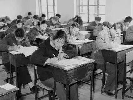 This picture shows students taking the College Entrance Exam after its resumption. In which year was the exam reinstated?