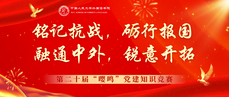 为深入学习贯彻党的二十届四中全会精神,传承伟大抗战精神,引导广大青年铭记抗战历史、增强民族自信、勇担时代使命,外国语学院党建促进会面向中国人民大学外国语学院全体学生开展“铭记抗战,砺行报国;融通中外,锐意开拓”——第二十届“嘤鸣”党建知识竞赛。