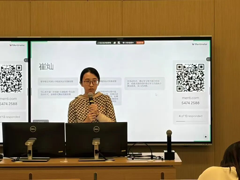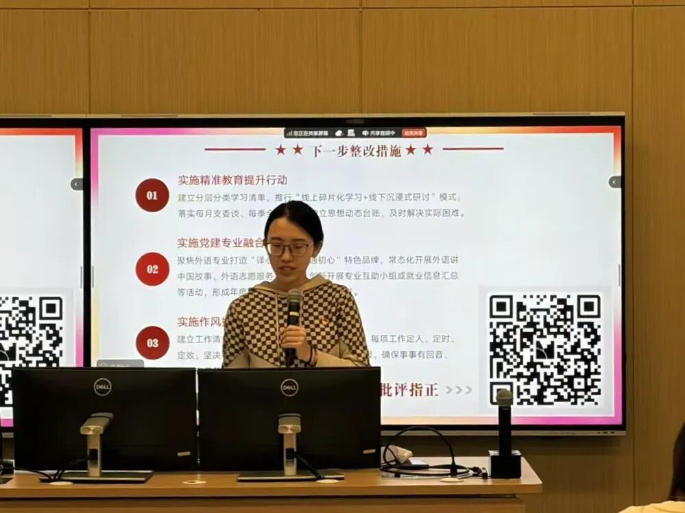 崔灿代表党支部委员会作对照检查报告。她系统梳理了理论学习方式单一、思想引导不够深入、教育形式创新不足、党建与专业融合不深等问题,从政治站位、宗旨意识、能力本领三个维度剖析问题根源,并提出精准教育提升、党建专业融合、作风执行力提升三项整改举措。