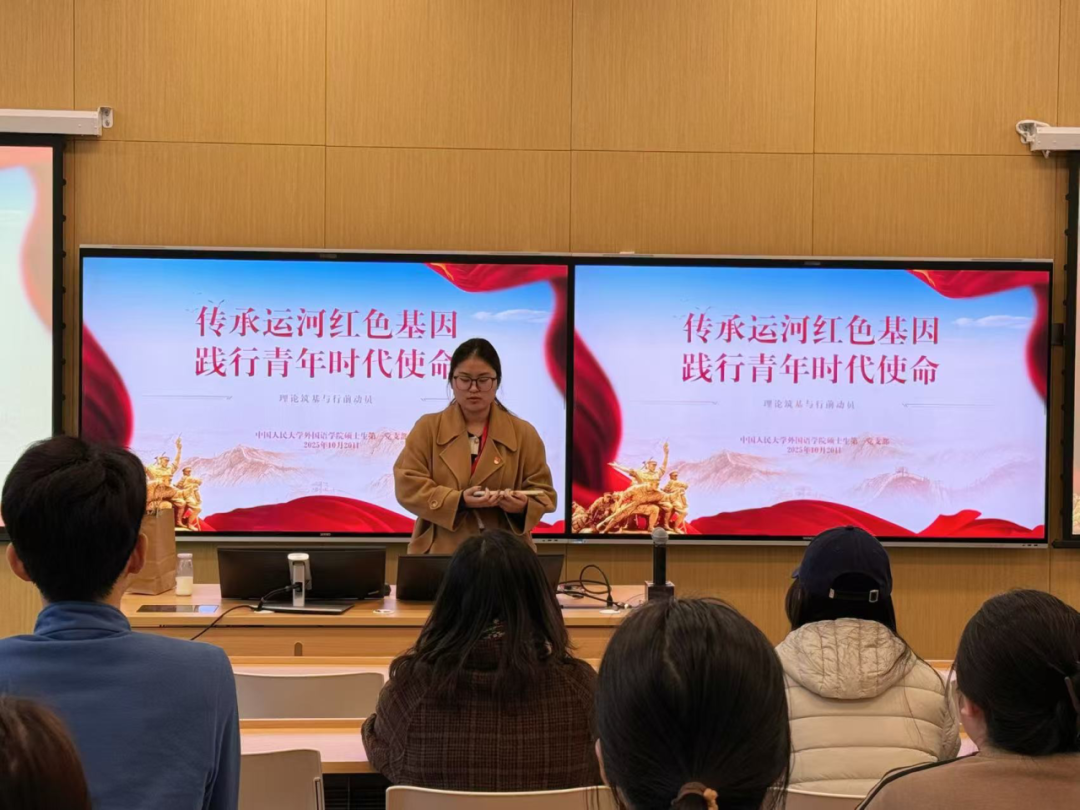 10月20日,2025级硕士生第一党支部在公学二楼303教室开展“传承运河红色基因,践行青年时代使命”主题党日活动。党支部书记陆晨主持活动,支部全体党员参加活动。