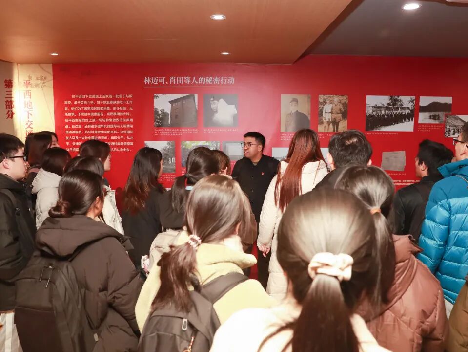 全体师生在阳台山参观“红色血脉 —— 平西地下交通线主题展”,回顾平西地下交通线英勇斗争的抗日战争史。这条隐藏于山林间的“生命线”,曾承担情报传递、干部转移与物资输送的重任,见证了平西军民在中国共产党的坚强领导下不畏牺牲、坚守信仰的革命精神。全体成员深入了解林迈可、贝熙业等国际友人与中国人民并肩抗战的感人事迹,深刻体悟了国际主义精神的崇高内涵,纷纷表示将立足外语专业优势、勇担沟通中外的时代重任。重走原山道,全体师生切身感受到那段艰苦卓绝岁月中革命先辈的斗争智慧与坚定信念。