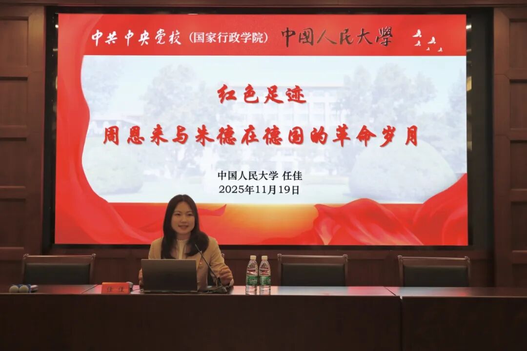 我院党员任佳结合外语学科特色,以“红色足迹:周恩来与朱德在德国的革命岁月”为题作专题报告。她联系学院“党建知识竞赛”等品牌活动,以及成仿吾老校长五次翻译《共产党宣言》的历程,强调既要及时学习党的最新理论成果,也要深入理解党的理论在翻译与传播中不断发展完善的历史进程,并指出外语专业在促进党的理论国际传播中发挥着不可替代的桥梁作用。她还通过珍贵影像资料,生动讲述了周恩来在柏林组建党组织、朱德经其介绍入党的历史细节,再现了革命先辈在海外的奋斗足迹,深刻诠释了早期共产党人坚定的理想信念与深厚的家国情怀。