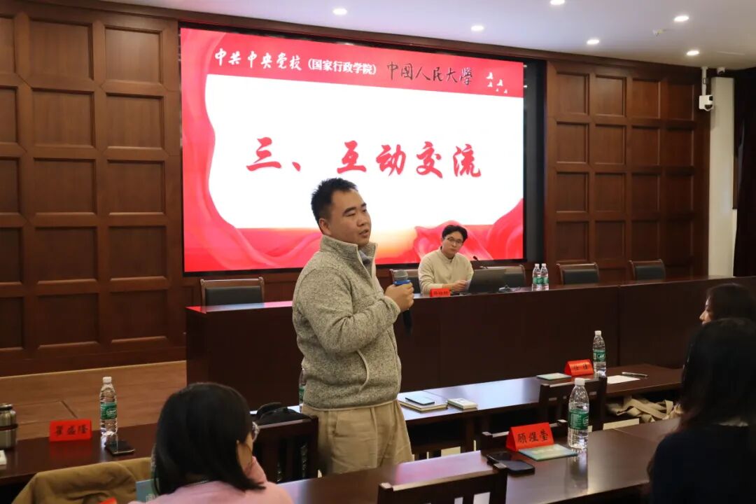 在总结交流环节,来自两校的三位学生代表先后分享学习体会与实践思考。中央党校硕士研究生巩镇回顾了两校深厚的历史渊源,并就推动党建工作与专业学习深度融合提出见解。中国人民大学硕士研究生王钦围绕学生党员如何学习贯彻全会精神,提出“深化理论学习、落实传播责任、坚持知行合一”的实践路径,并强调要将宏观规划思维融入日常学习生活。中国人民大学硕士研究生张又文指出,外语专业学生应努力实现从“见证者”到“讲述者”的角色转变,善用专业优势向世界生动讲述中国共产党治国理政的精彩故事。