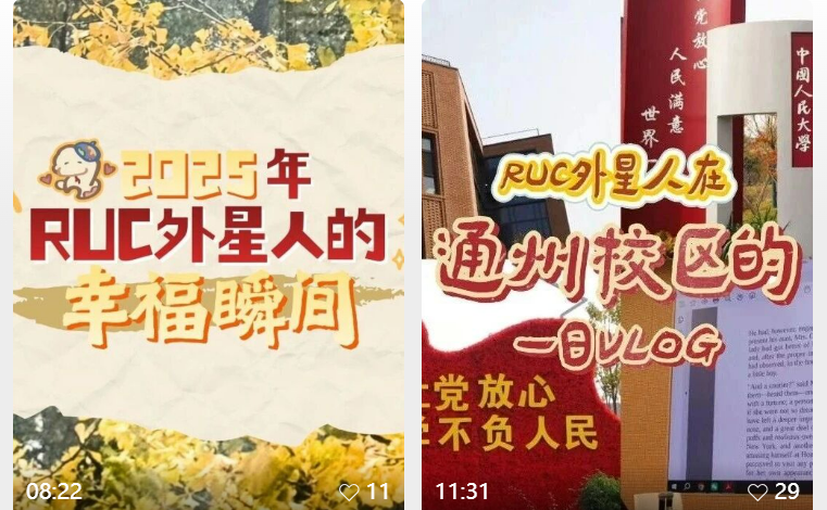 在动态叙事与活动创新方面,我们积极拓展新媒体叙事与互动体验。策划推出“RUC外星人在通州校区的一日VLOG”“2025年外星人的幸福瞬间”系列主题视频,以生动影像呈现校园生活与情感共鸣;组织策划“RUCers新年拍摄专场”活动,通过镜头记录美好瞬间,强化集体记忆与仪式感,持续构建具有温度与活力的学院故事体系。