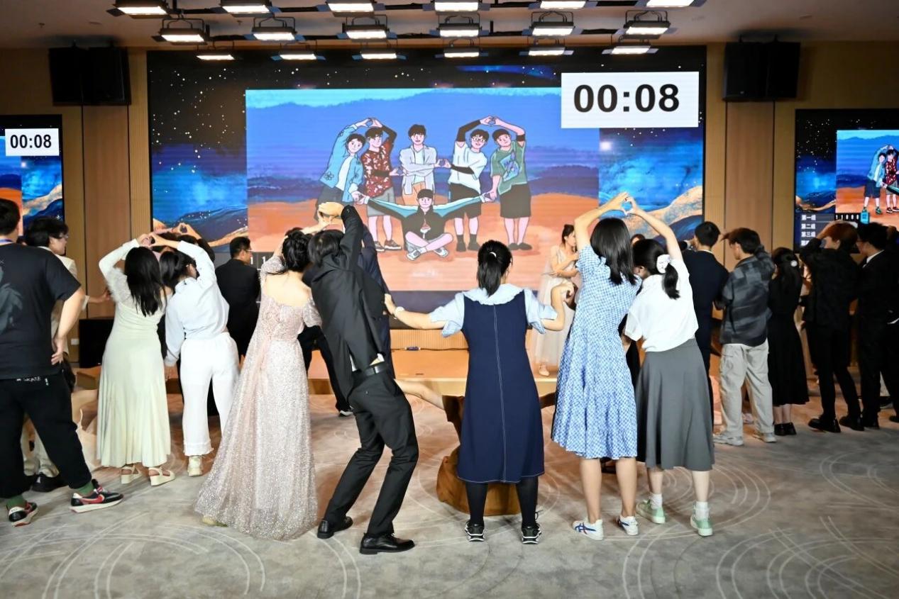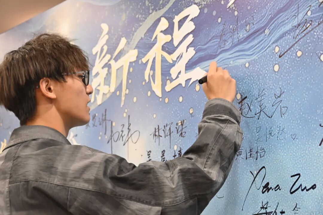 学子彬彬,女孩娉婷,在星槎主题的背景板前执笔签名,留下最初的印记。笑语盈盈间,彼此的倩影与名字一同定格,初见的羞涩渐渐融于流转的灯光里。