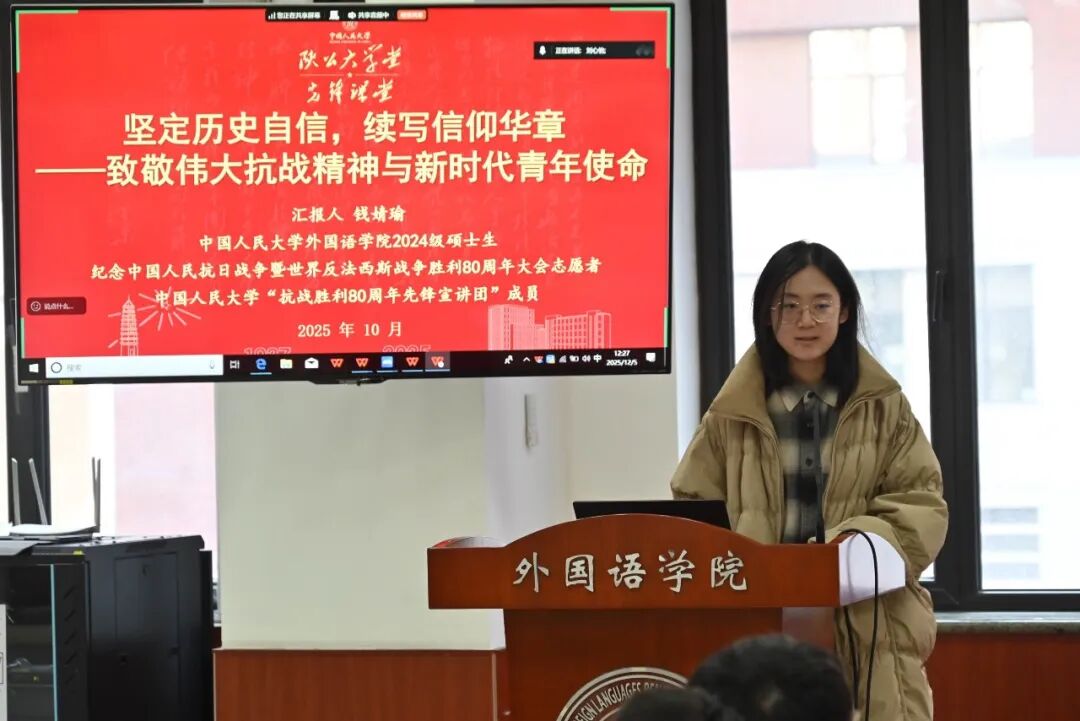 钱婧瑜讲述了她在纪念中国人民抗日战争暨世界反法西斯战争胜利80周年大会的志愿服务经历,为在场听众带来了一场穿透岁月的精神洗礼。她回忆道:“当全球媒体的镜头扫过时,我们代表的不是个人,而是中国青年的形象。我们不仅要细致周到地服务好每一位观礼嘉宾,更要以专业、严谨的姿态,向世界展现新时代中国青年的昂扬风貌、自信风采和务实态度。”她提及,尽管从凌晨两点持续工作至下午两点,身体疲惫、嗓音沙哑,“但精神缺格外充盈,因为志愿者们以实际行动践行着与先辈们一脉相承的爱国信仰,让青春在服务家国中绽放力量。”在深情讲述中,钱婧瑜将现场师生的思绪引向了历史的纵深处。她以杨靖宇将军的铁血丹心与“少年铁血队”的铮铮风骨为精神坐标,带领大家完成了一次跨越时空的信仰对话。她号召新时代青年要主动成为历史薪火的接棒者,将个人奋斗自觉汇入民族复兴的洪流,以更坚定的文化自信与历史主动,在时代征程中书写无愧于前辈、无愧于人民的青春答卷。