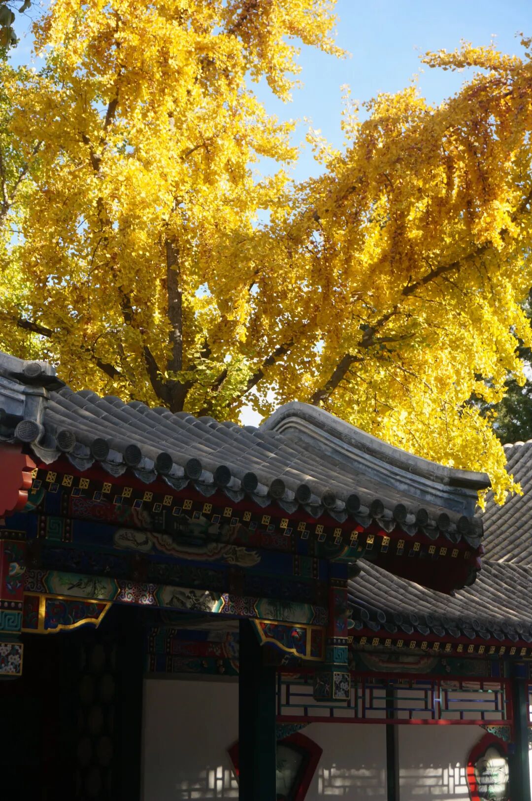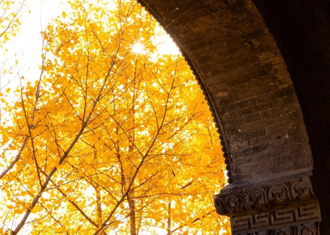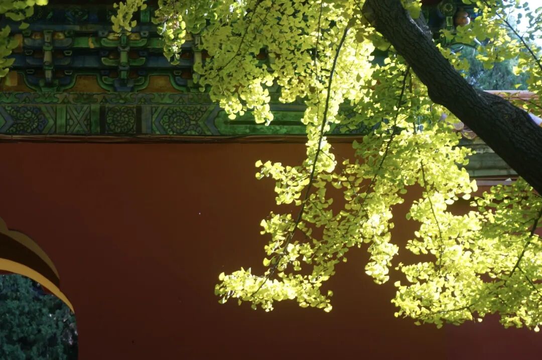 阳光穿过银杏枝叶,在朱红墙与彩绘斗拱间洒落,古典与自然交融。
