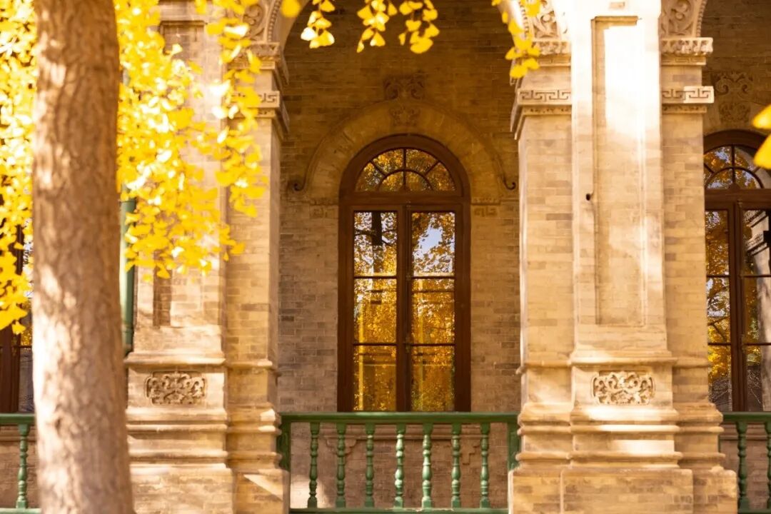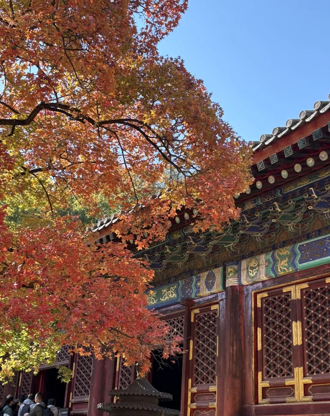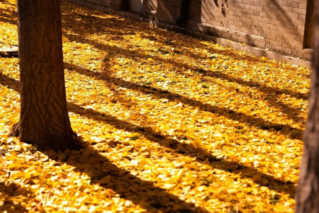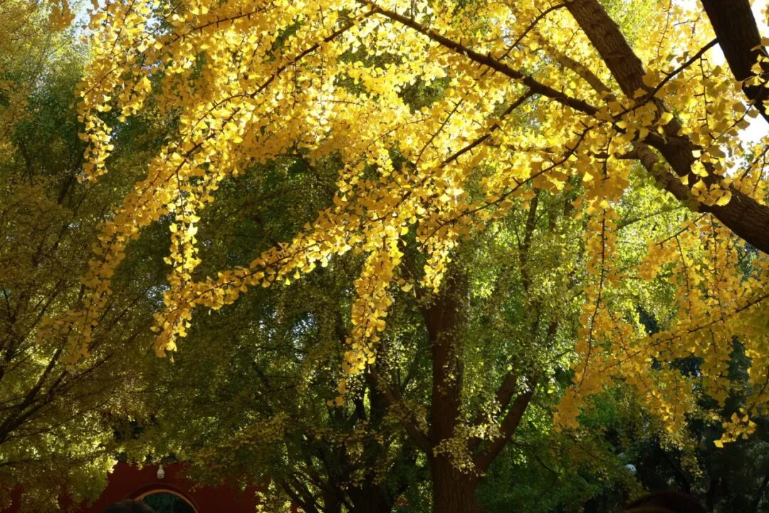 阳光穿过银杏枝叶,在朱红墙与彩绘斗拱间洒落,古典与自然交融。