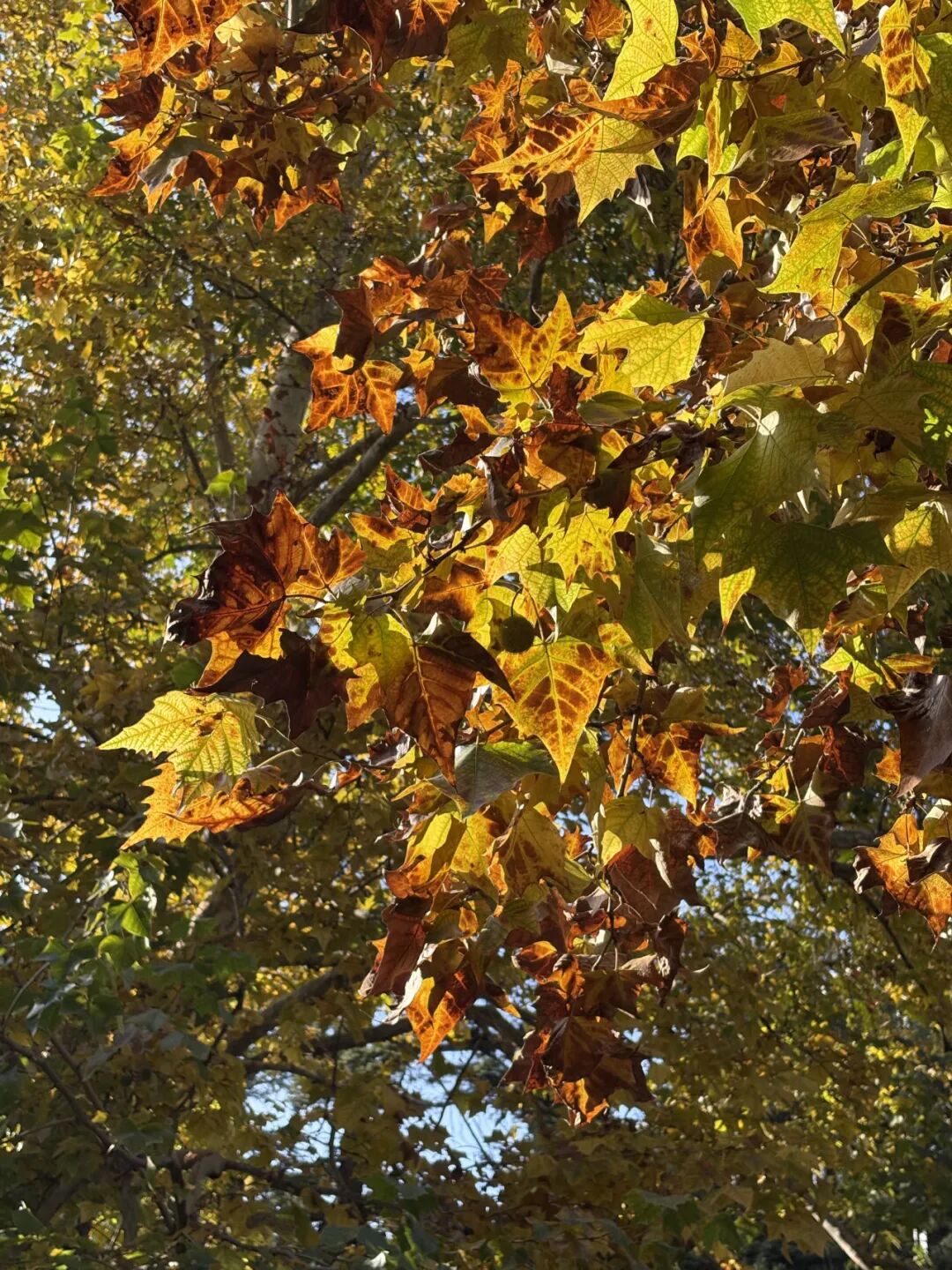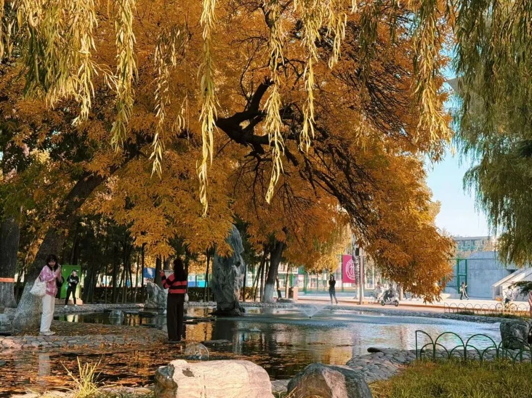 初秋午后的一勺池,一勺池旁边的树最早显露出秋日的色彩。成团的黄叶坠下来压低了枝丫,金黄的色彩映在清澈的池水中。