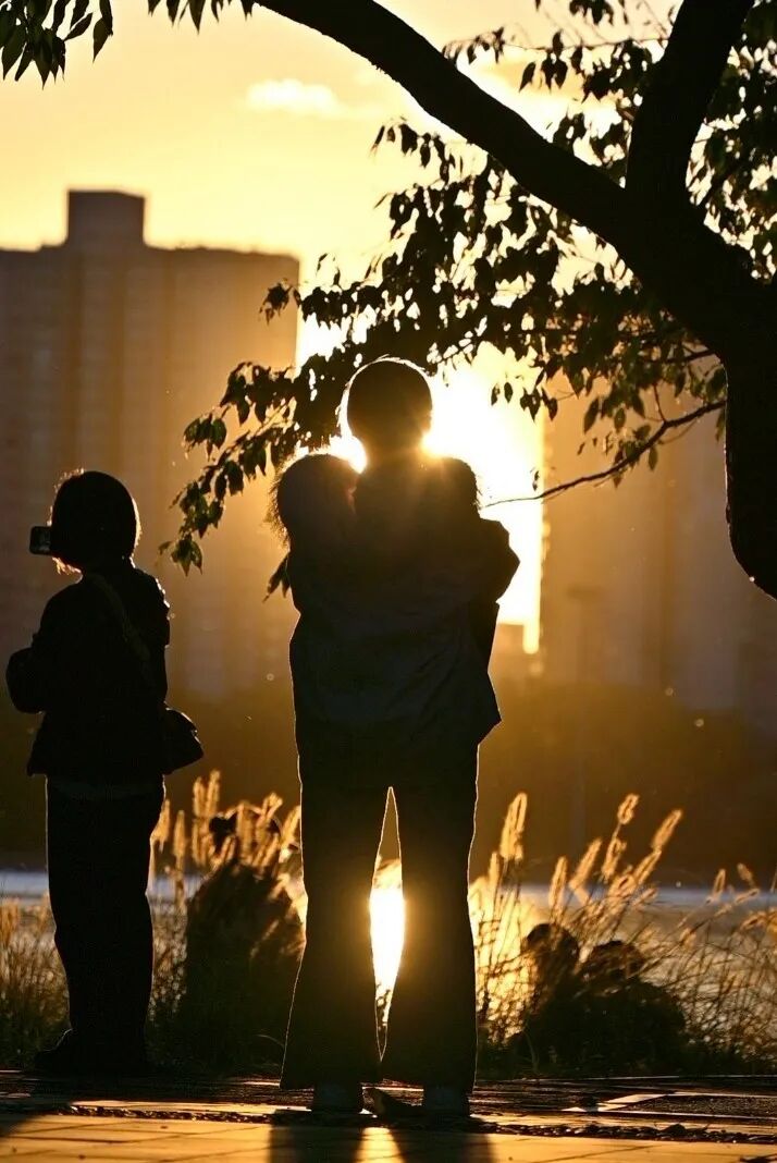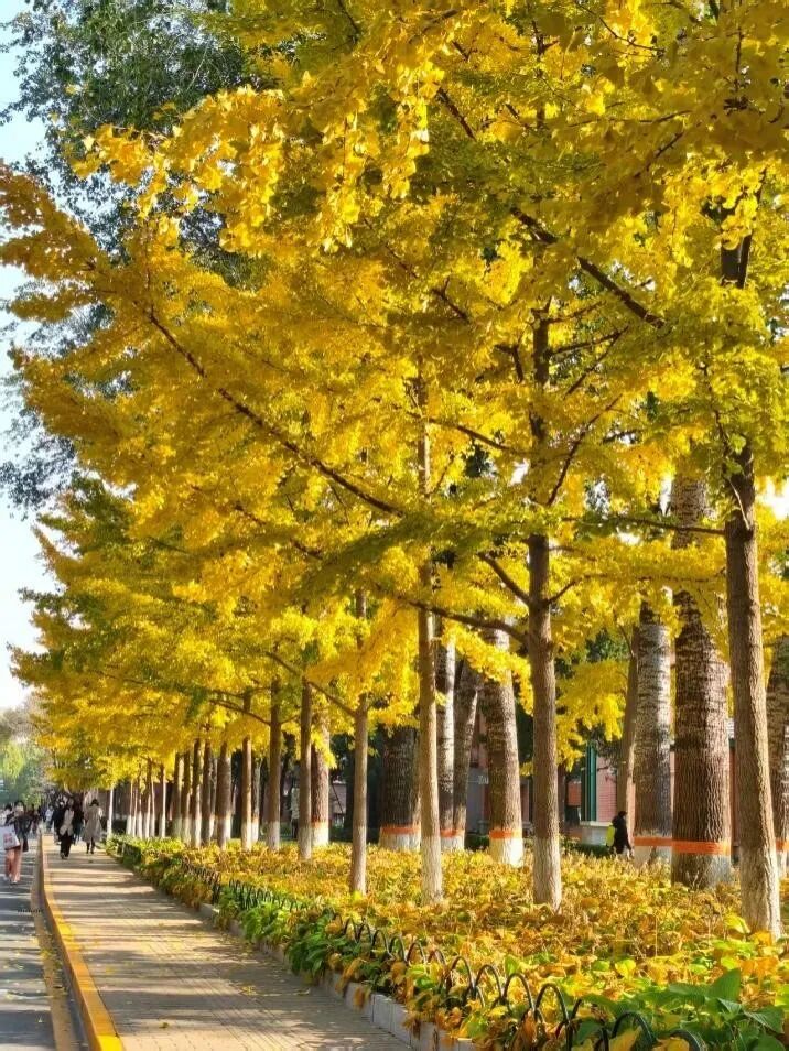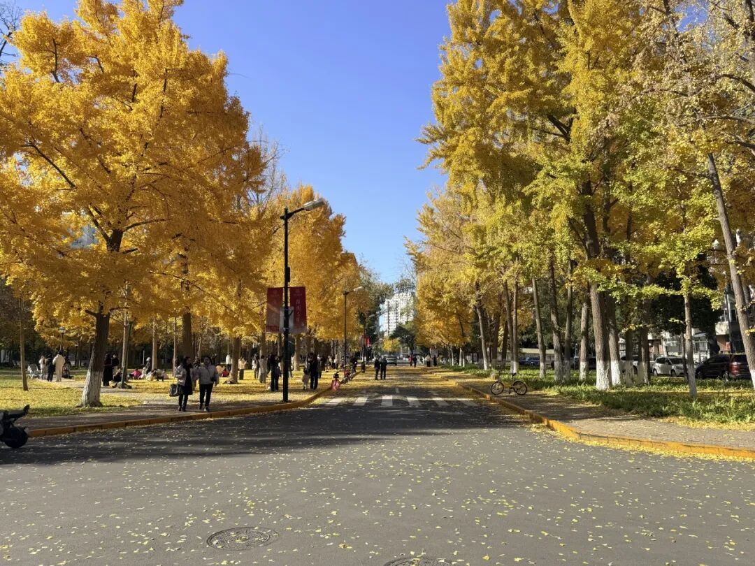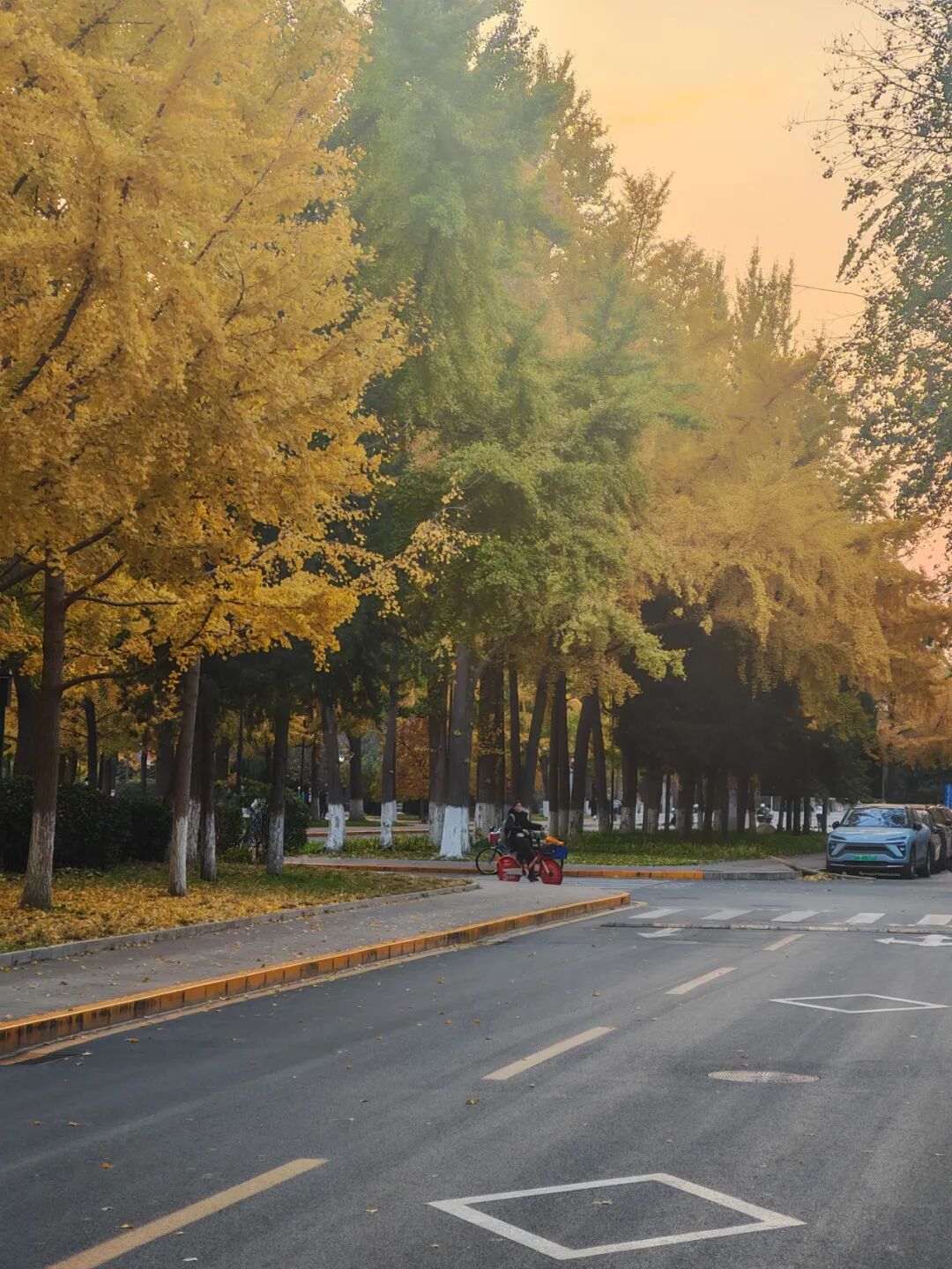在人大校园里,道路旁的银杏树半黄半绿,落叶铺了一地,暖调的霞光裹着树影,连空气都浸着秋的松弛。