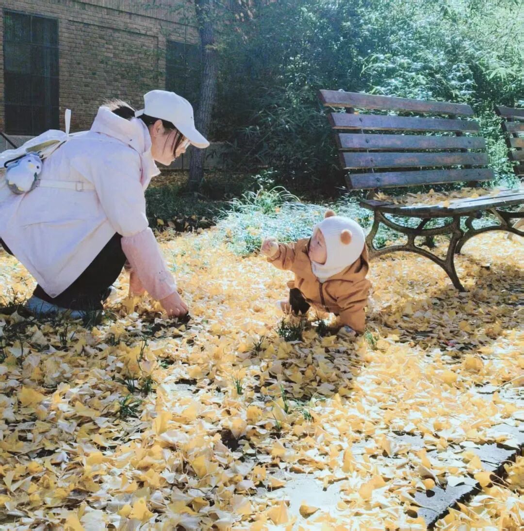 铺了满地的银杏叶像打翻的阳光,小宝贝在金箔似的落叶里扒拉好奇;大姐姐蹲下来,带着同样的欣喜和他一起接住这秋天的温柔碎片。
