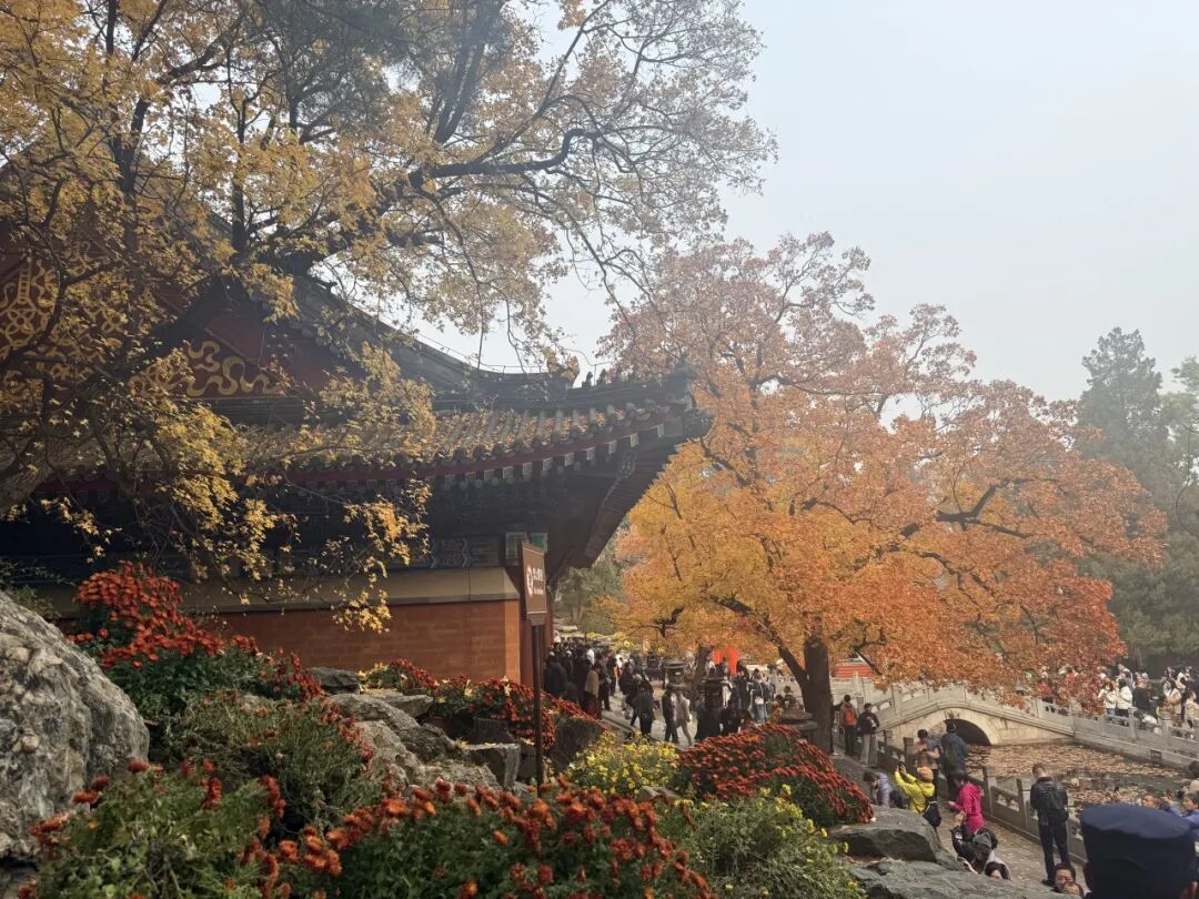 这两张拍摄于香山公园的勤政殿前,初红的枫叶和中式古建把秋日的古意与明艳揉得恰到好处,虽然只有两棵树叶子红了,香山早已游人如织。