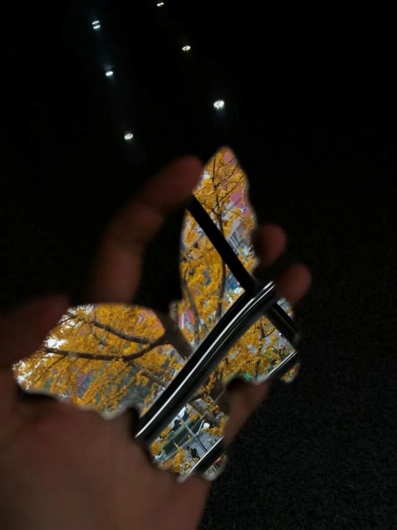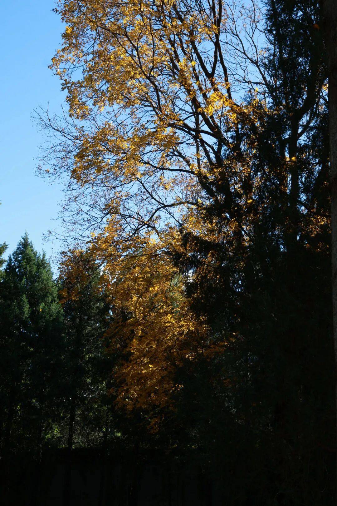 我时常认为金色是死亡,因为照片最终会泛黄,树叶变金色后就会飘落。但是这个偶然把树干对准蝴蝶镜子的时刻让我想起了小时候简笔画的蝴蝶,那个时候我以为它们身上的线条是骨骼与神经。金色是生命。