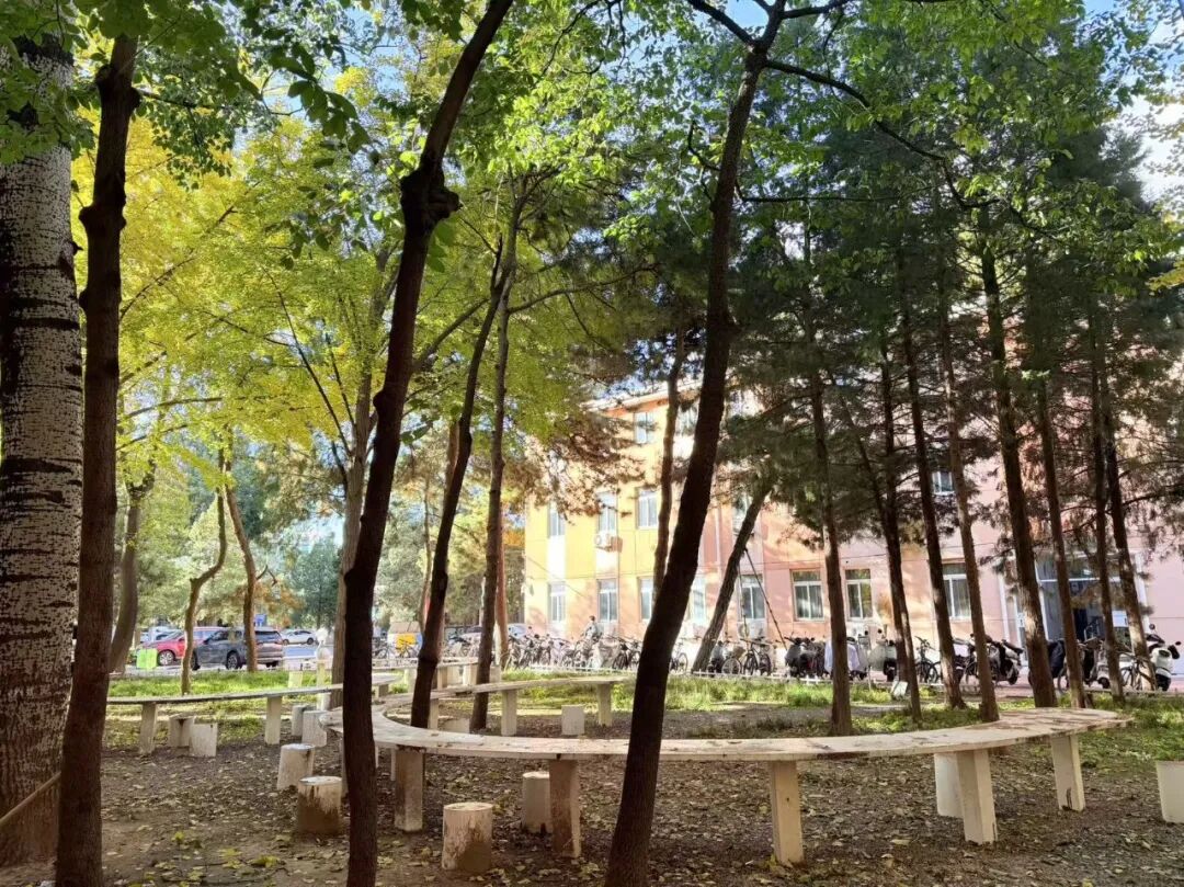 在东风楼群间的草地,秋日午后,穿过几个咖啡馆,看到林木错落成诗。银杏泛黄、松柏苍绿,阳光透过枝叶洒在弧形长椅上,远处暖色调建筑与错落的车影相映,更添一丝静谧。