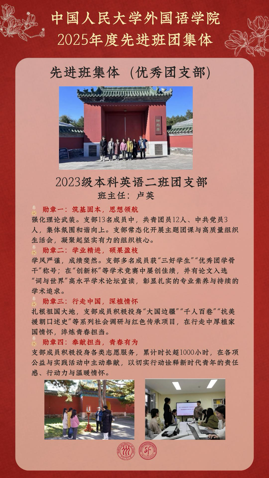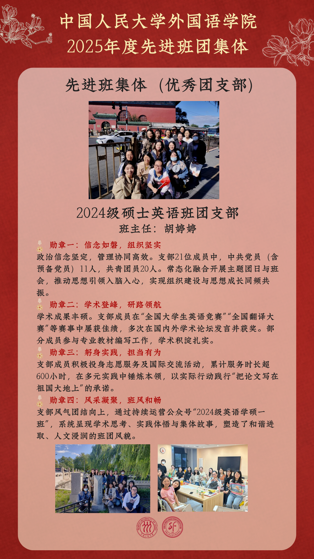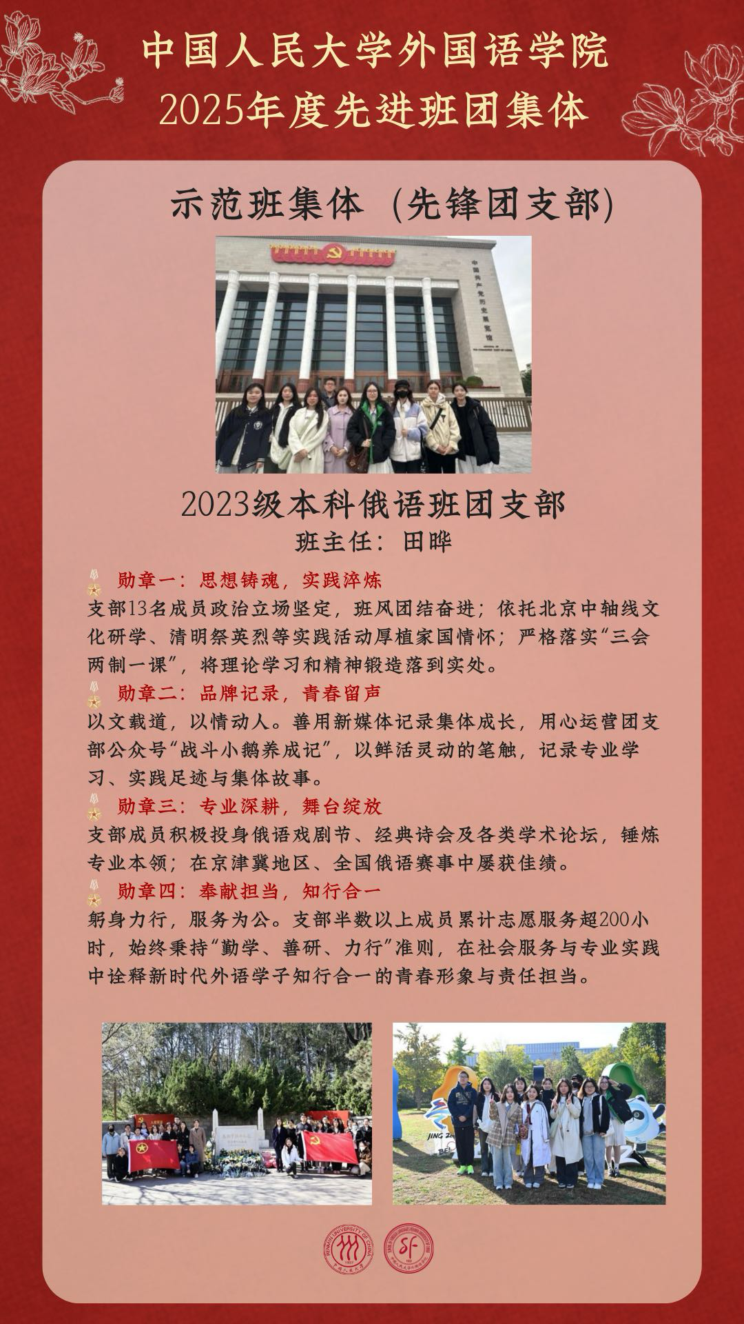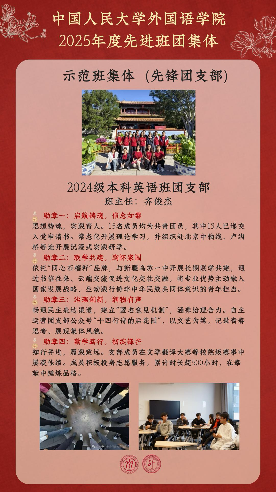 在中国人民大学2025年度先进班团集体评选中,外国语学院共有10个班团集体荣获表彰!其中,1个班团集体荣获“十佳班集体(红旗团支部)”称号,4个班团集体获评“示范班集体(先锋团支部)”,5个班团集体获评“先进班集体(优秀团支部)”。