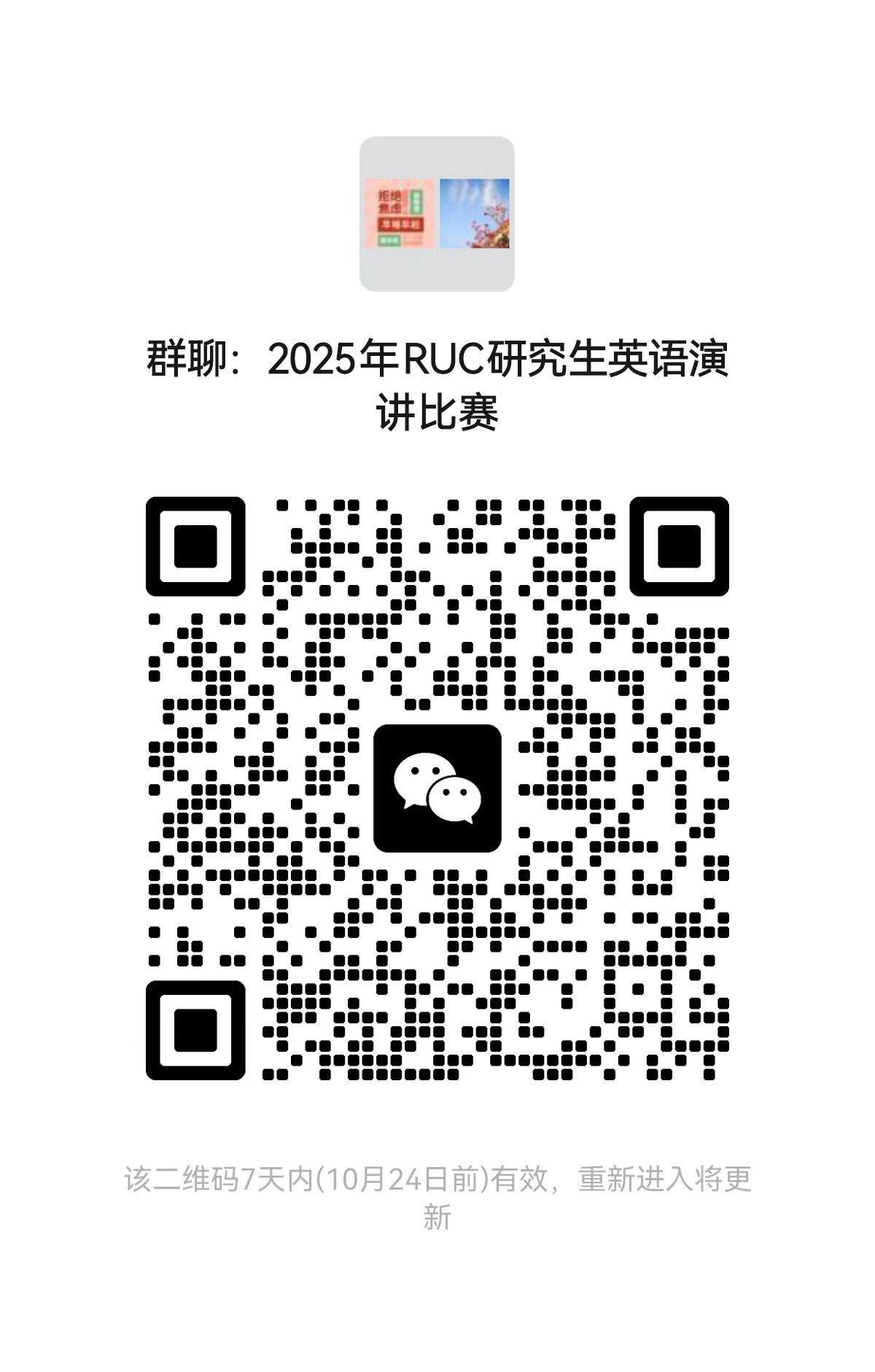 所有中国人民大学2025级非英语专业硕士生和博士生原则上都有资格报名参赛。通州校区、中关村校区有意参赛的同学和苏州校区初选赛优胜者请在11月8日(周六)前填写问卷星进行报名(可点击以下链接https://www.wjx.cn/vm/tiV54Jg.aspx或扫描下图中的二维码报名)。如有问题,请联系外国语学院教务科夏老师(办公地点:明德国际楼507,办公电话:010-62511752,电子邮箱:xiamiao@ruc.edu.cn)。同时,请扫码加入微信群,未来相关通知将通过微信群发送。