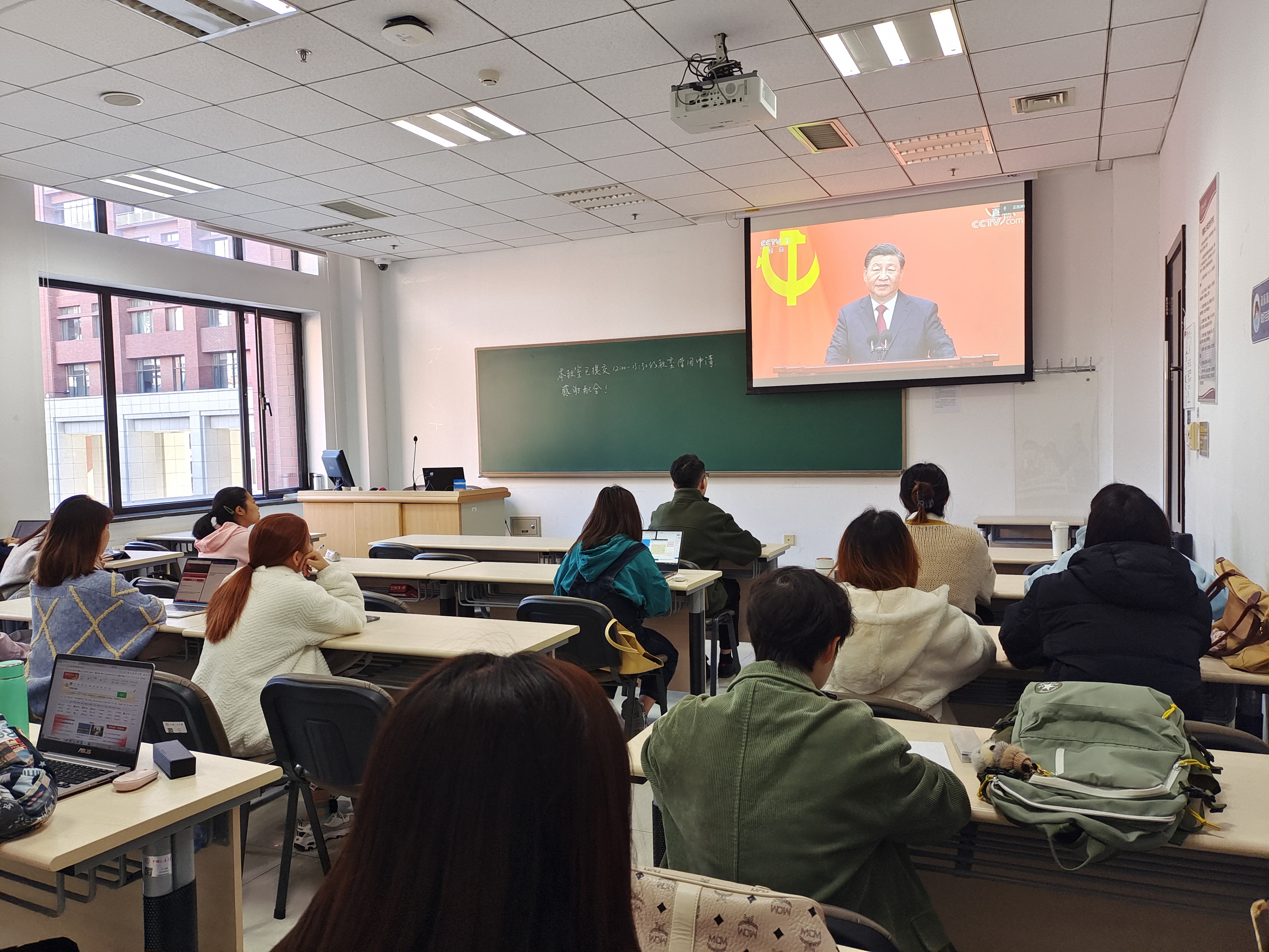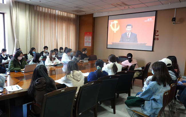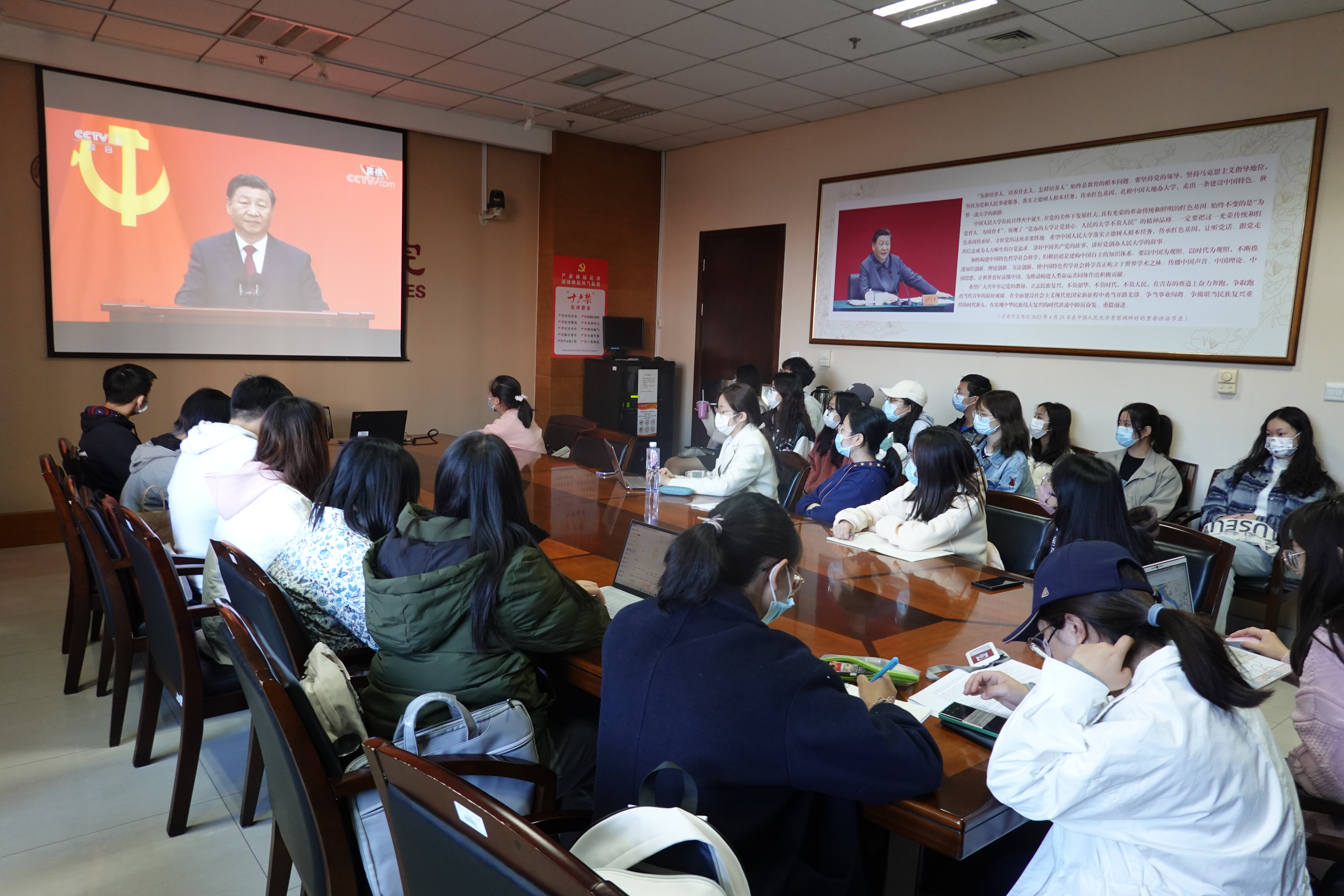 外国语学院党委组织师生在明德国际楼会议室、多媒体教室等集体观看了记者见面会现场直播,认真收听收看习近平总书记作重要讲话。