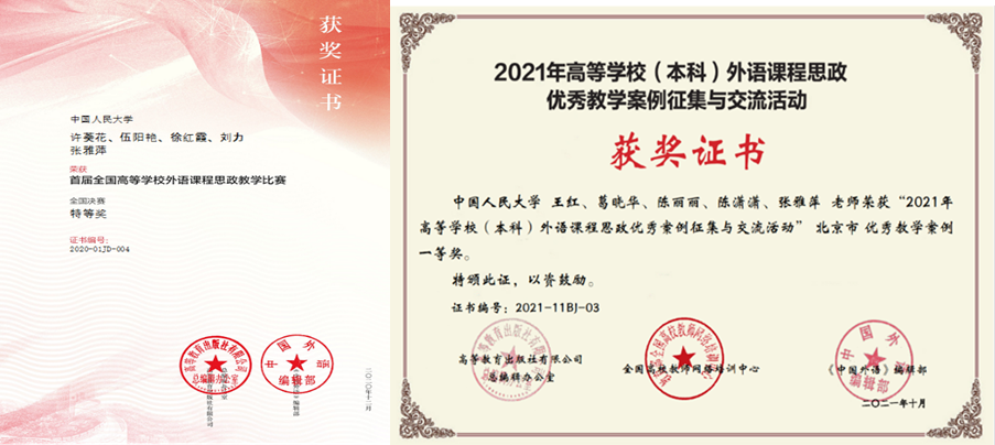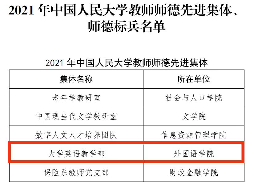2022年4月,经学校师德建设与监督委员会秘书处组织集中评审以及公示,学校党委决定,授予包括外国语学院大学英语教学部在内的五个集体“中国人民大学教师师德先进集体”荣誉称号!