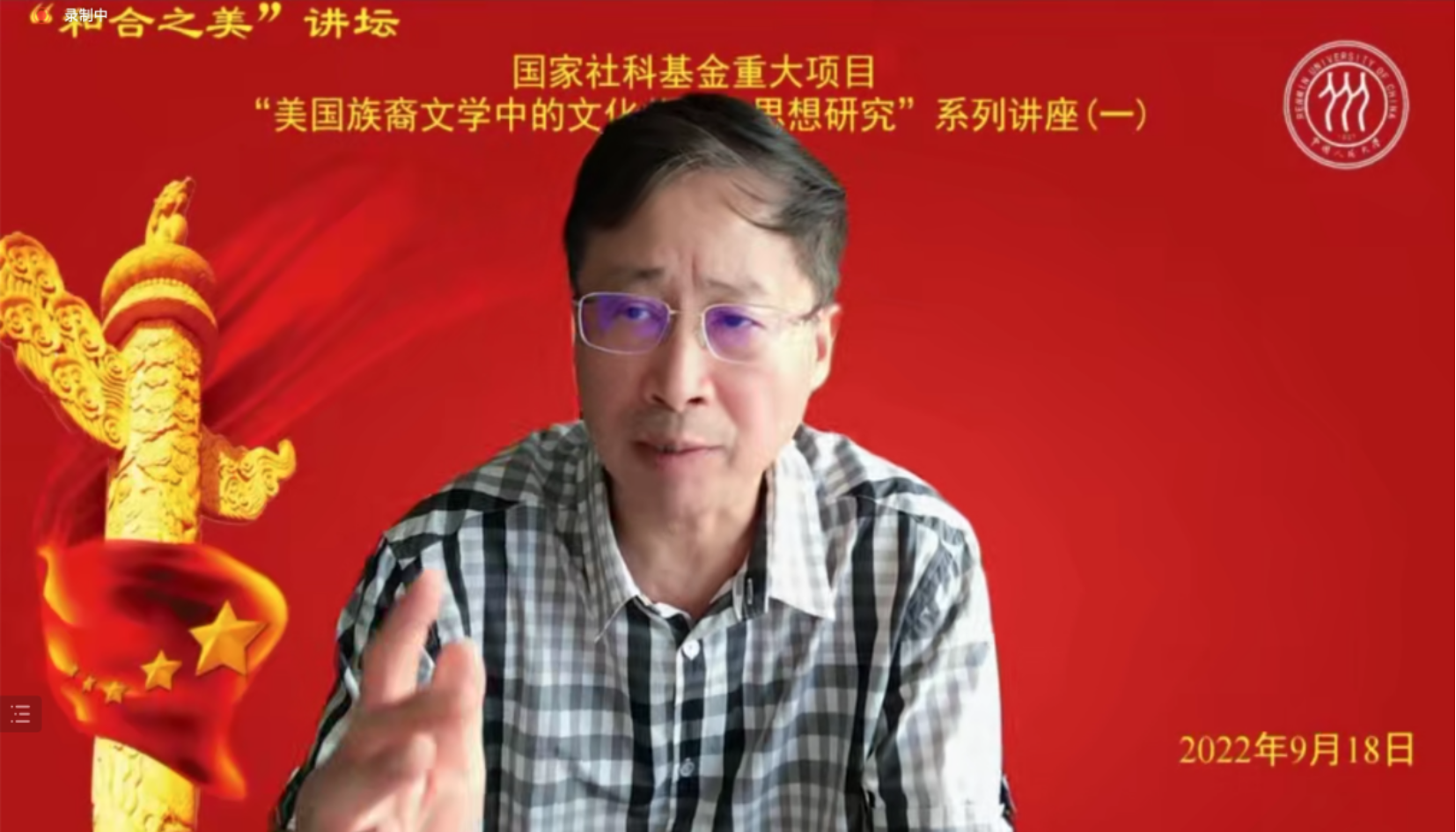 2022年9月18日,为推动“美国族裔文学中的文化共同体思想研究”的深入开展,加强与国内外学术界的交流,中国人民大学外国语学院郭英剑教授领衔的国家社科基金重大项目课题组举办“和合之美” 系列讲座“共同体与文化共同体概念辨析”第一讲。本次讲坛邀请了三位知名学者担任主讲人:上海外国语大学李维屏教授、杭州师范大学殷企平教授和北京外国语大学潘志明教授。讲座由郭英剑教授主持。本次讲座采用腾讯会议形式线上进行,共约800位师生全程参加。