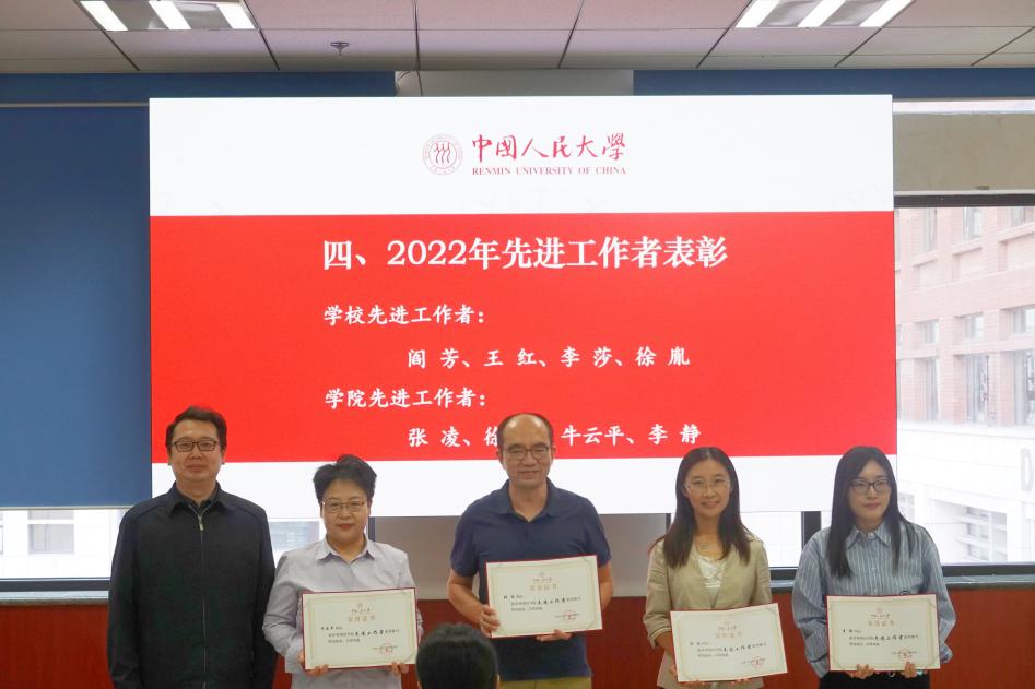 为感谢教师们对学院工作的付出,会上进行了“2022年先进工作者表彰”仪式。党委副书记李佳伟宣布我院推荐阎芳、王红、李莎、徐胤四位教师参评“学校先进工作者”荣誉称号;张凌、徐园、牛云平、李静四位教师获得“学院先进工作者”荣誉称号。李佳伟书记为获得院级荣誉称号的四位教师颁发了荣誉证书,感谢他们对学院工作的辛勤付出。