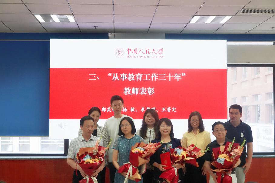 为发扬外国语学院尊师重教的光荣传统,我院对“从事教育事业三十年”的郭英剑、杨敏、李慧明、王著定四位教师进行了表彰。外国语学院院长陈方为教师们颁发纪念证书。新入职教师为四位教师献上了鲜花,致敬他们将青春奉献给中国教育事业的敬业精神。