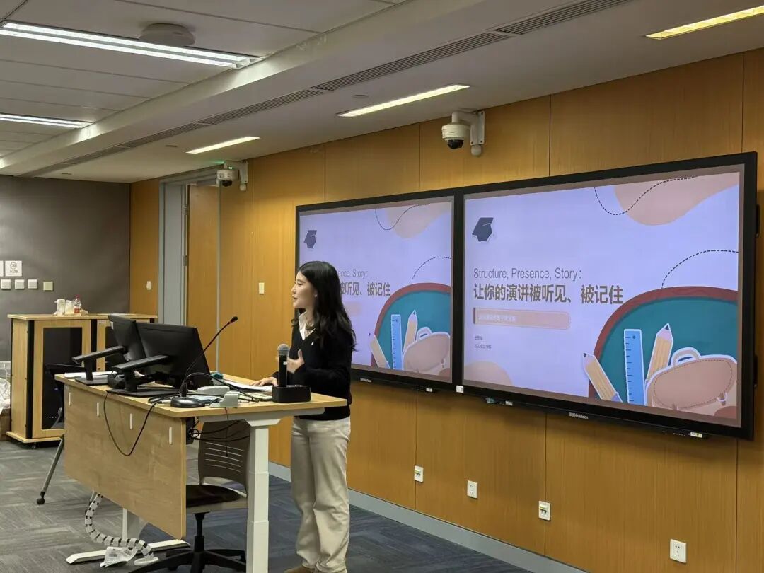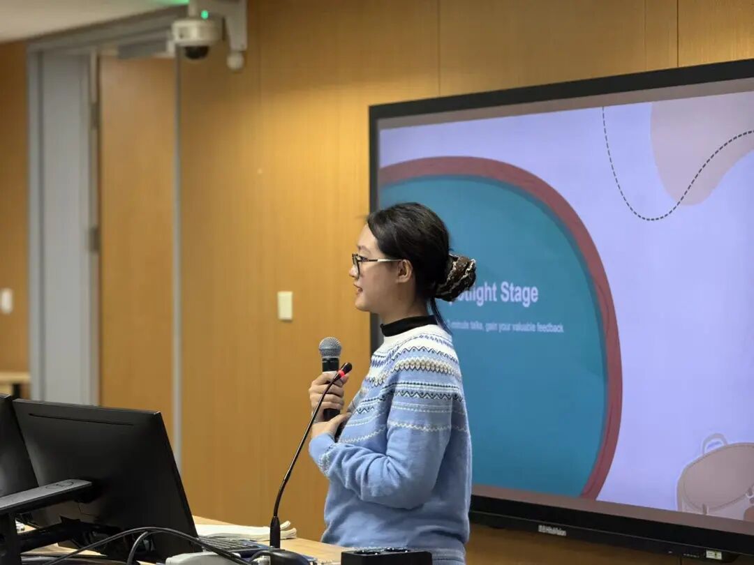 经验分享环节,2022年北京市大学生英语演讲大赛一等奖获得者法学院2022级本科生岳丽锱结合自身从中学到大学的英语演讲实战经历,系统梳理出提升演讲表现的三重关键:结构、表达与故事。她指出,结构是演讲的坚实骨架,表达是传递思想的桥梁,而故事则是触动心灵的灵魂。最后她总结道,演讲的本质不在于完美表演,而在于真诚沟通与情感共鸣。