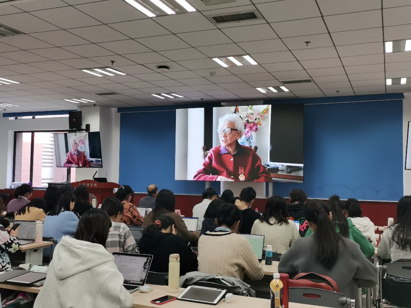 随后,在场学生集体观看了刘季华教授的采访纪录片,聆听刘老师参加抗美援朝的经历,跟随刘老师的回忆感受峥嵘岁月中的英雄事迹。采访中,刘季华教授动情地唱起《中国人民志愿军战歌》:雄赳赳,气昂昂,跨过鸭绿江……她回忆道,战场上条件艰苦,战士们只能用钩子和扁担做武器,所以也被亲切的称作“扁担英雄”。不论是承担通信联络工作的通讯兵,还是肩负保障任务的工程兵,都和奋战在枪林弹雨中的前线战士一样,随时做好了牺牲的准备,抗美援朝、保家卫国。退伍后,面对中央给转业女兵提供的不同出路,刘老师坚决选择了考大学,并将中国人民大学作为自己的第一和唯一志愿,因为人大是我们党创办的第一所新型正规大学。这部采访纪录片由学院党委特别组织拍摄,旨在为同学们提供与抗美援朝中的英雄儿女、与历史见证者面对面的机会,接受最好的爱国主义教育和党史学习教育。