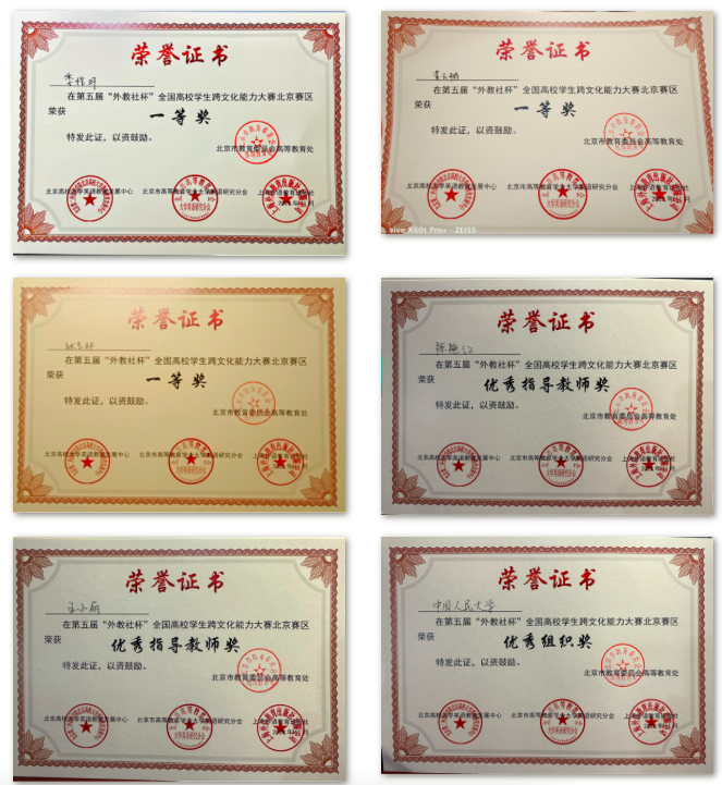 2022年11月5-6日,第五届“外教社杯”全国高校学生跨文化能力大赛北京赛区复赛及决赛成功举办。由我院陈艳红和王小丽老师指导的中国人民大学代表队获得一等奖,两位指导教师分获“优秀指导教师奖”,我校荣获“优秀组织奖”。
