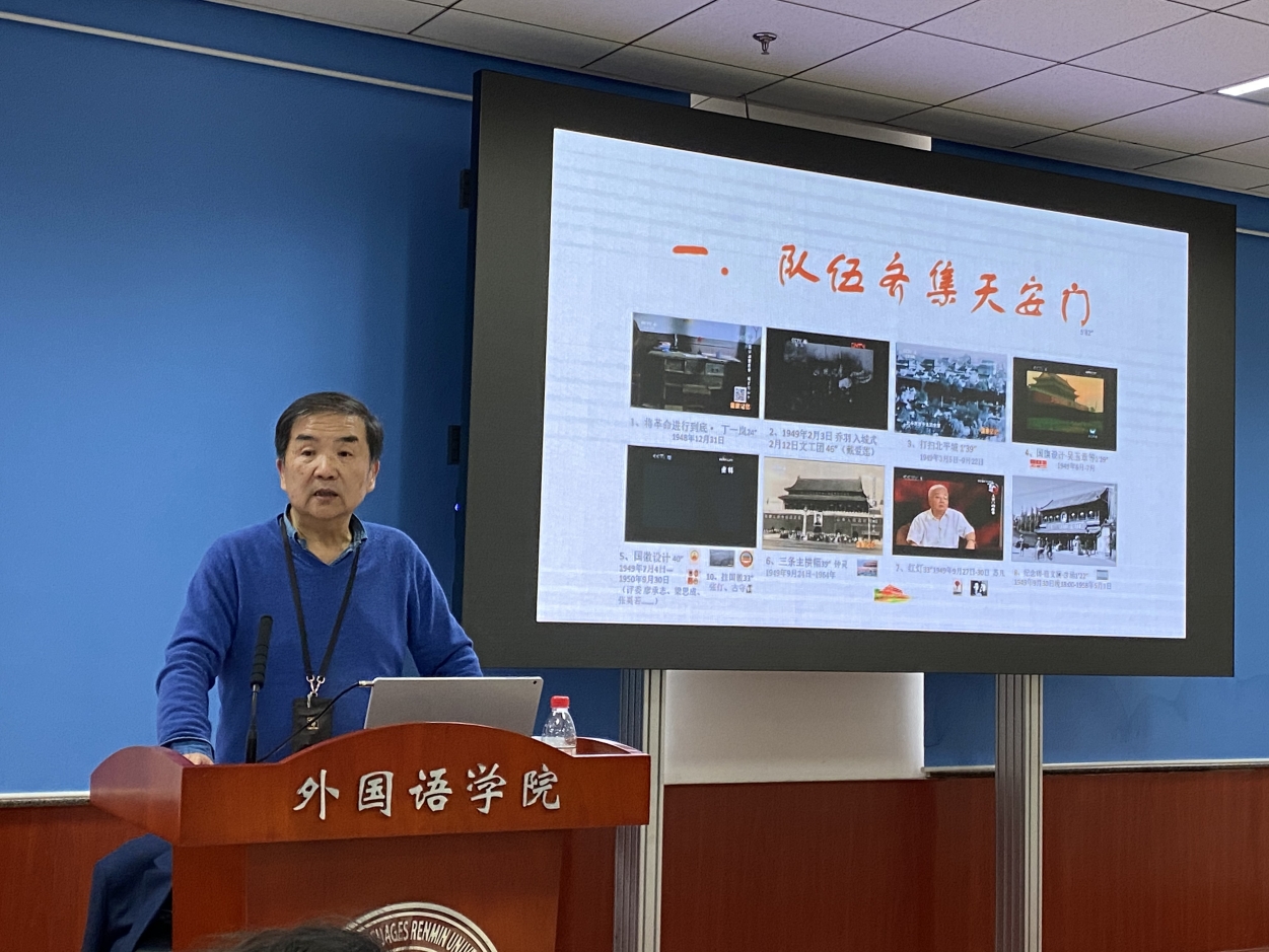 王学军老师向师生介绍了中国人民大学的“前世今生”。从陕北公学到华北大学,再到中国人民大学,我们的学校诞生于抗战烽火之中,继承了延安的传统和党的红色基因,从一开始就与国家和民族同呼吸、共命运,始终把想国家之所想、急国家之所急、应国家之所需作为建校、成长和发展的主题主线。“队伍齐集天安门”讲述了华北大学师生为迎接开国大典,发挥不怕脏、不怕累、不怕苦的实干精神,参加了北平城的打扫清洁和垃圾处理工作,极大地改善了北平人民的卫生健康状况;“五百学子护大典”见证了一支由五百名华大学子组建起来的纠察队,在准备开国大典的过程中全力保障天安门广场安全,保卫开国大典顺利举行;作为开国大典当天唯一通过金水桥主桥经过天安门的学校,“珍贵记忆世代传”将华北大学的无上荣光和为国为民、勇于奉献的精神定格在新中国历史的开篇中;“南下北上擎旌旗”彰显了华北大学干部队伍“祖国事业重如山,个人名利淡如水”的风骨,他们在解放战争时期和新中国建设时期支持配合党的工作,南下北上、无私奉献、甘于牺牲;“同志们万岁”不仅介绍了“把最好的歌唱给祖国”的著名歌唱家郭兰英,还有像核武器专家吴际霖一样把最好的青春献给国家,在隐姓埋名中干惊天动地大事的伟大功臣。中国人民大学为我国革命、建设、改革事业培养输送了一批又一批优秀人才,在我国高等教育史上留下了浓墨重彩的一笔。