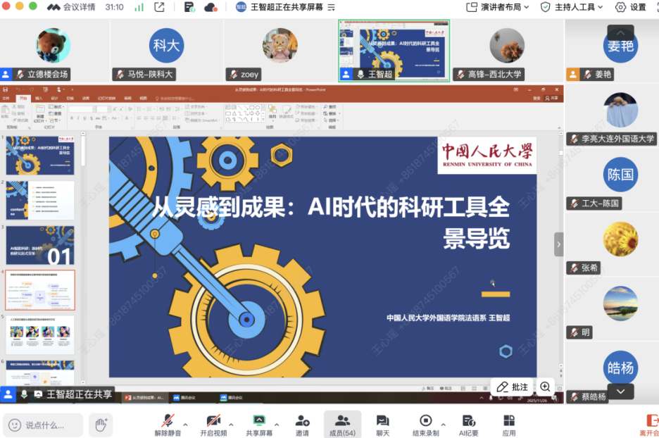 中国人民大学外国语学院法语系讲师王智超紧跟AI时代浪潮,介绍了AI赋能科研的新范式与技术。从利用智能工具进行跨语言文献语义挖掘与关联发现,到通过自然语言指令轻松完成复杂的数据清洗与分析,再到部署本地化私有知识库以实现安全高效的知识管理,王智超全景式展现如何将这些工具嵌入到文献调研、实验设计、论文写作、成果展示等的每一个环节,帮助同学们在AI时代显著提升研究效率与创新能力。
