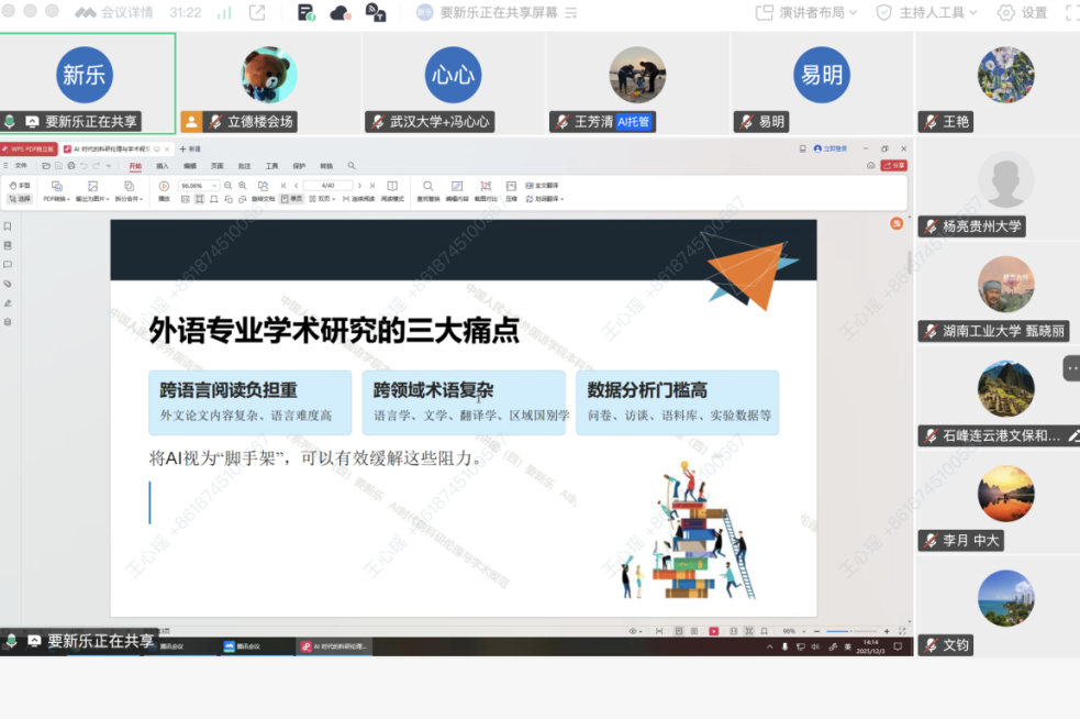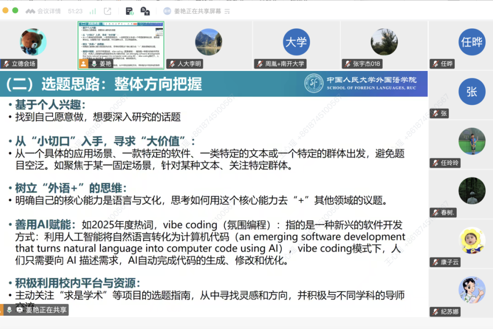 为系统提升本科生科研创新能力,搭建贯通式的学术成长平台,外国语学院于2025年11月12日至12月10日,以线上线下相结合的形式,成功举办六场“本科生科研素养提升”系列讲座。本系列讲座精准聚焦外语学科特色,内容涵盖从选题挖掘、项目申报、工具使用到伦理规范的全链条,为同学们带来了一系列干货满满的知识盛宴。每场讲座均吸引线上线下、校内校外百余名师生参与,除本校学生外,更有清华大学、北京大学、北京航空航天大学、南开大学、武汉大学、西北工业大学、中山大学等多所高校同学参与,形成了跨校联动、资源共享、思想碰撞的浓厚学术交流氛围。