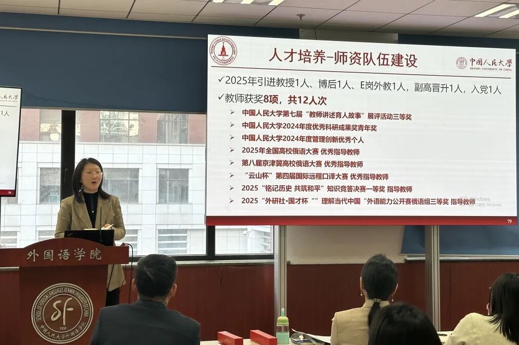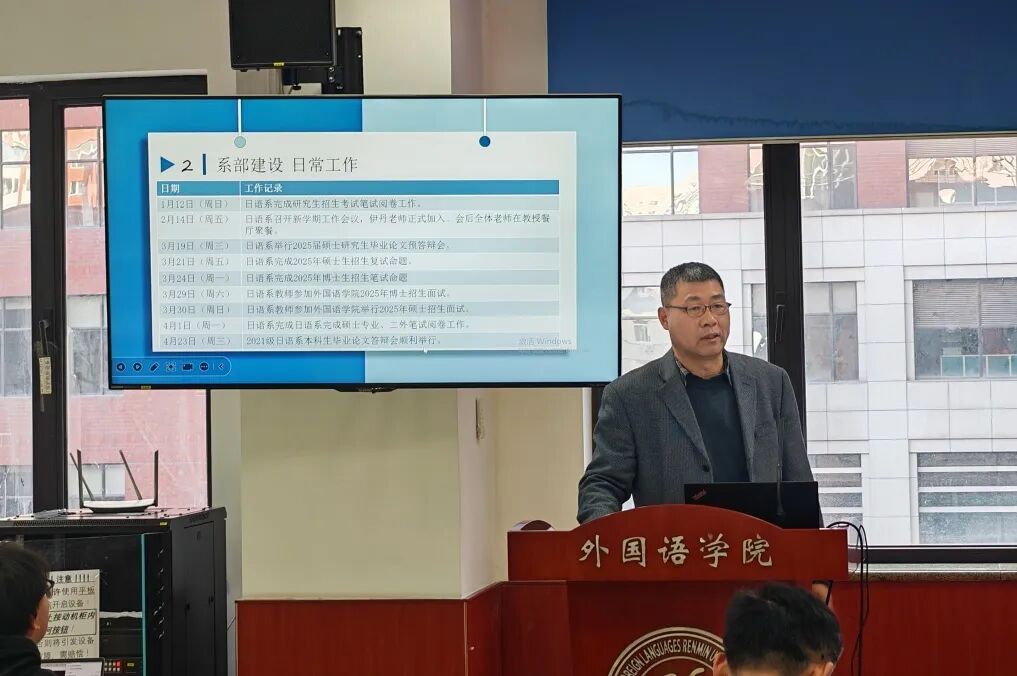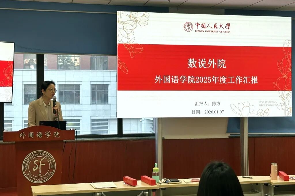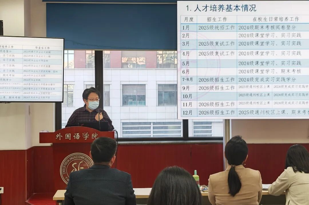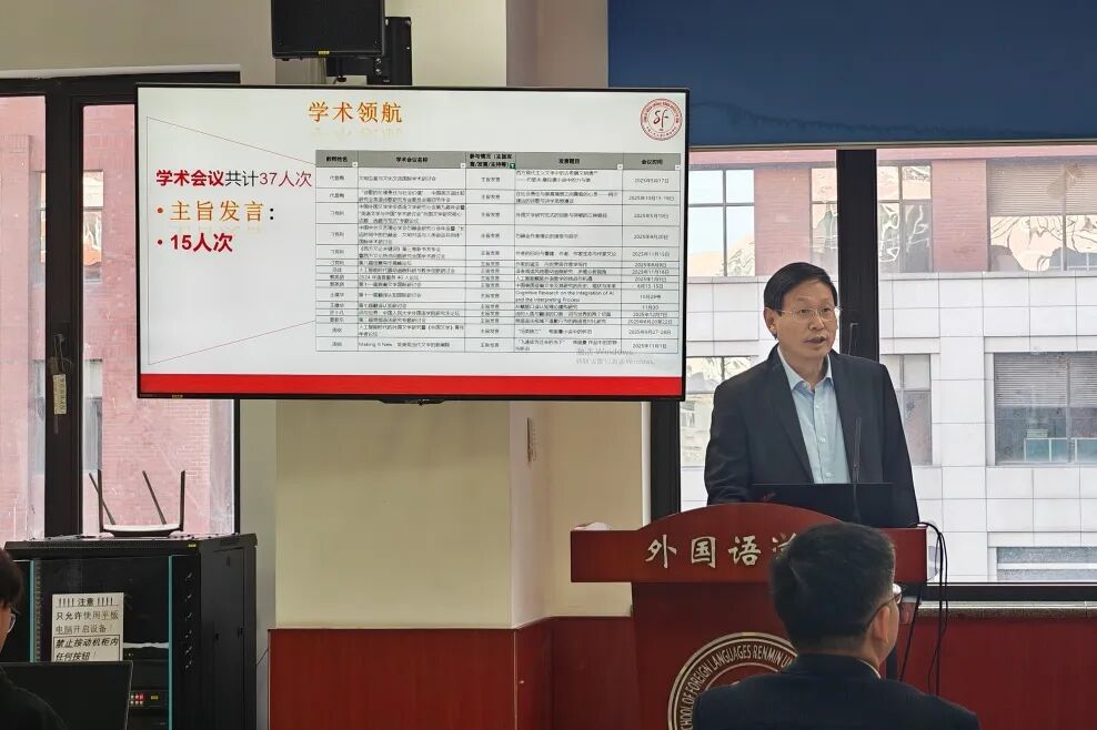 九位系部(中心)负责人依次汇报2025年度工作情况与2026年工作思路。过去一年,各系部持续优化教学资源配置,推动学科交叉融合,协同育人机制进一步完善;招生工作稳中有进,生源结构持续优化,毕业生就业竞争力与社会认可度不断提高;科研项目申报稳中有进,学术成果影响力稳步扩大;学生语言实践能力与跨文化素养同步增强,复合型人才培养模式成效凸显;依托专业特色开展的社会服务与文化传播活动也取得积极反响。面向2026年,各系部围绕学科与育人体系建设提出了各自的发展思路,积极探讨培养更多高素质人才和产出创新成果的实施路径。