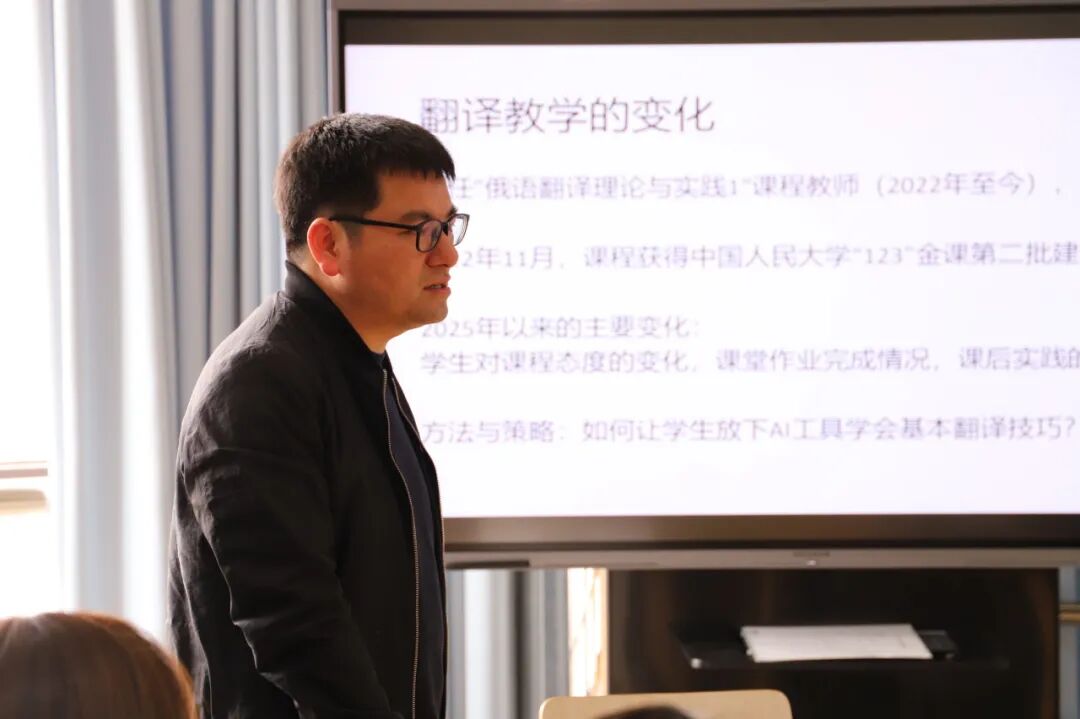 活动邀请北京大学外国语学院德语系长聘副教授毛明超,外交学院西语国家研究中心主任孟夏韵,中国人民大学外国语学院俄语系副教授张猛、世界文学与全人类共同价值研究中心副主任吕如羽、外国语学院西语系讲师李卓群参与分享与讨论。活动由北京高校青年教师先进教研工作室领军人物、中国人民大学外国语学院副院长伍倩主持。与会人员围绕人工智能背景下翻译教学的转型路径与实践经验展开深入交流。