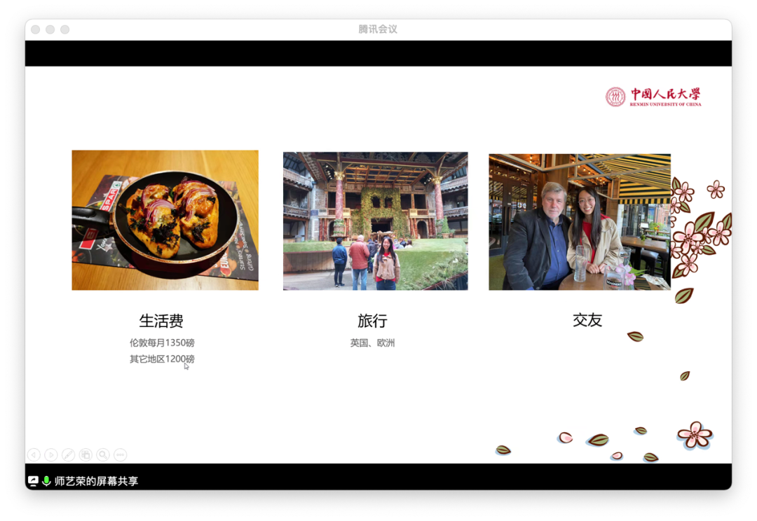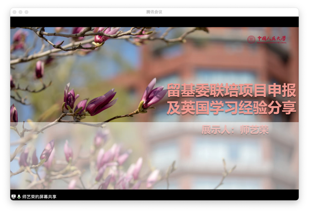 师艺荣同学从申请经历、学习经历、生活经历三个部分对自己的英国学习经验进行了分享。首先,她从“取得语言成绩”、“选择心仪学校”、“与国外导师沟通交流”、“获得邀请函”、“向留基委提交申请”、“申请成功后的手续”及“出国后流程”七个步骤详细阐释了自己的申请经验。接着,她对自己参加的课程、学术活动进行了介绍。最后,她根据自己的亲身体验就大家关心的生活问题进行了讲解。