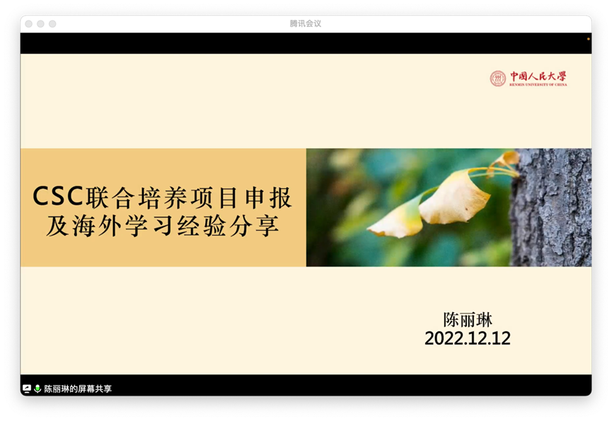 为贯彻落实党的二十大报告中提出的“实施科教兴国战略,强化现代化建设人才支撑”精神,加强博士生跨文化沟通能力和全球胜任力,在中外交流互鉴中提升博士生培养质量,学院于2022年12月12日下午通过腾讯会议平台线上举办了国家留基委联合培养博士生项目申报及海外学习经验分享交流会。会议由学院教务科董丹萍老师主持,2018级博士生陈丽琳和2019级博士生师艺荣就“项目申报及海外学习”这一话题进行了经验分享,学院30余名研究生参加了本次会议。
