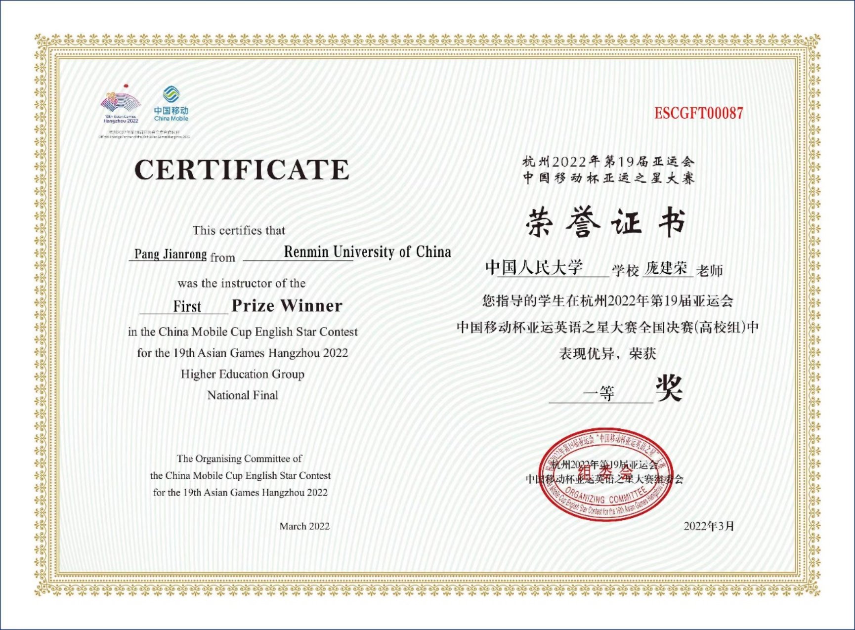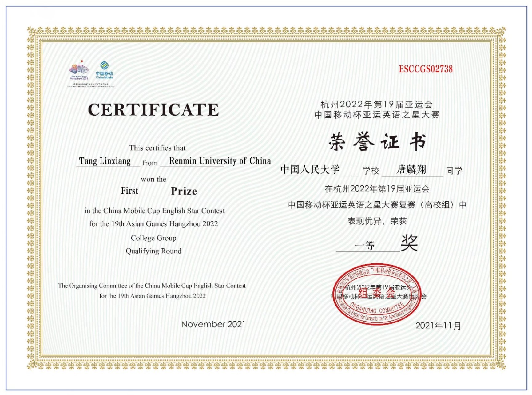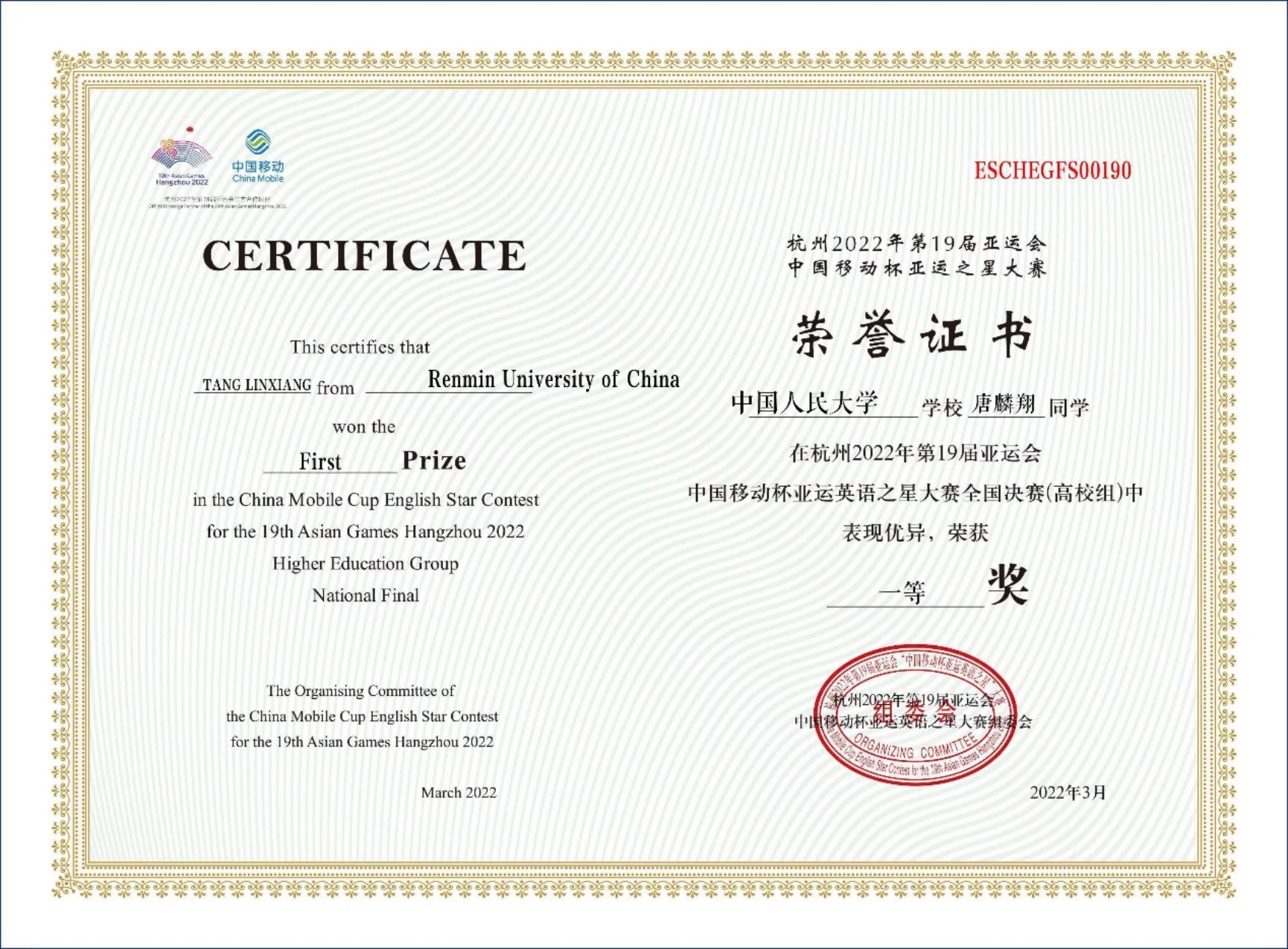 在2022年3月27日举办的第19届亚运会“中国移动杯亚运英语之星”大赛全国总决赛中,中国人民大学外国语学院2020级英语二班国际新闻全英文方向本科生唐麟翔,获得全国总决赛一等奖、全国复赛一等奖。指导老师为2020级英语二班班主任庞建荣老师。