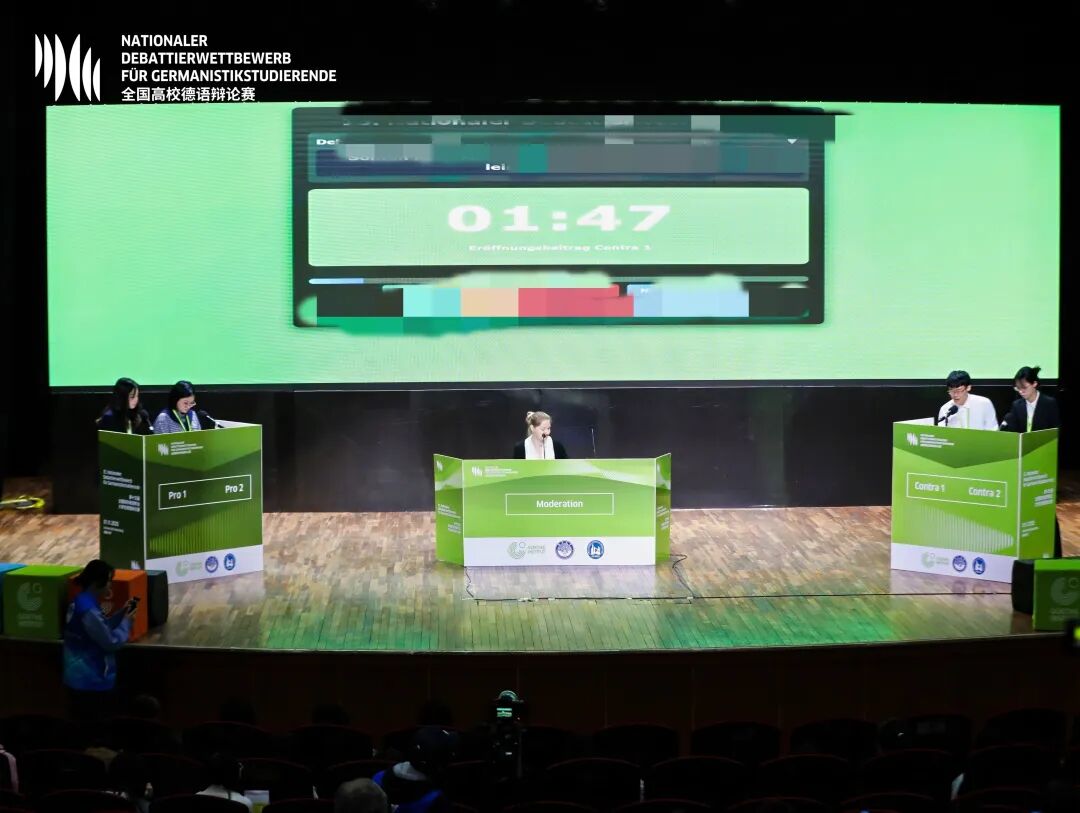 共有16支队伍晋级决赛阶段,并于11月1日在南昌大学前湖校区音乐厅展开激烈角逐。决赛赛制为淘汰赛,参赛者需现场抽取辩题与正反方,在10分钟内针对辩题独立讨论准备,随后立即登台展开辩论。在比赛现场,Marcel对两位同学给予了耐心的临场指导,尤其注重调整比赛心态。在众多的优秀学子面前,两位仅仅学习德语三年和两年的同学不惧挑战,从容应对,始终保持满满的自信和稳定的状态,展现出我院学子积极进取的精神风貌和扎实的专业素养,最终获得全国三等奖。