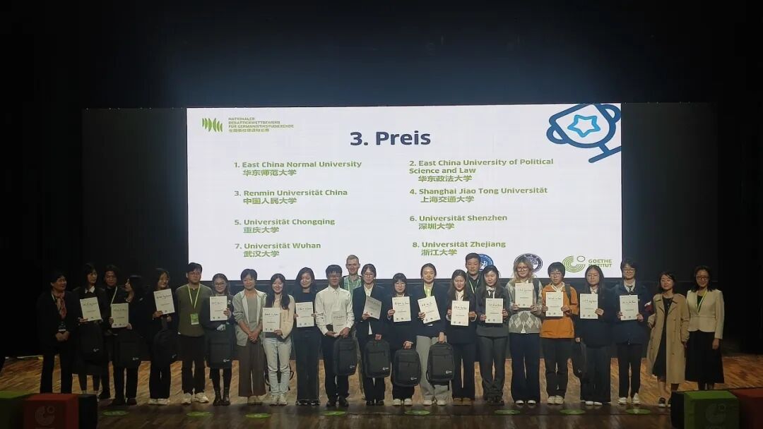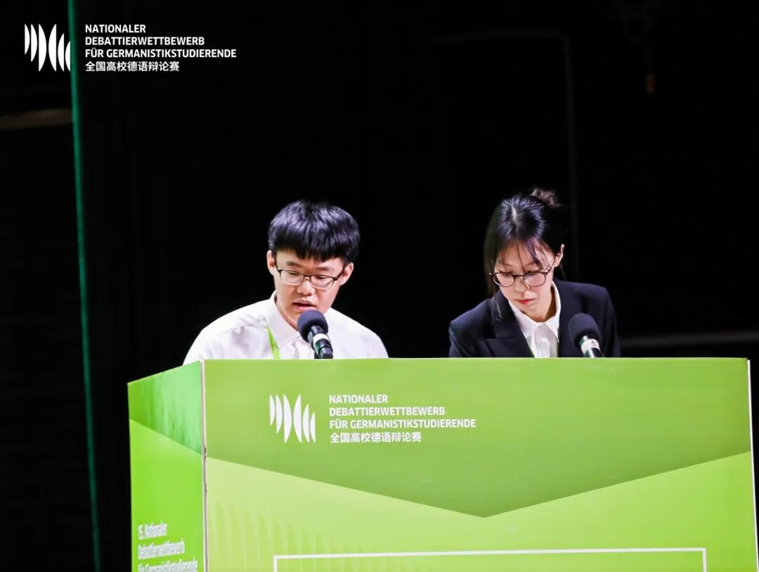 2025年11月1日,第十五届全国高校德语专业大学生德语辩论赛决赛在南昌大学音乐厅圆满落幕。我校德语专业2022级本科生陈宝森和2023级本科生穆艾琳在德语系教师张敏和外教Marcel Steffens的指导下代表我校参赛并荣获全国三等奖。