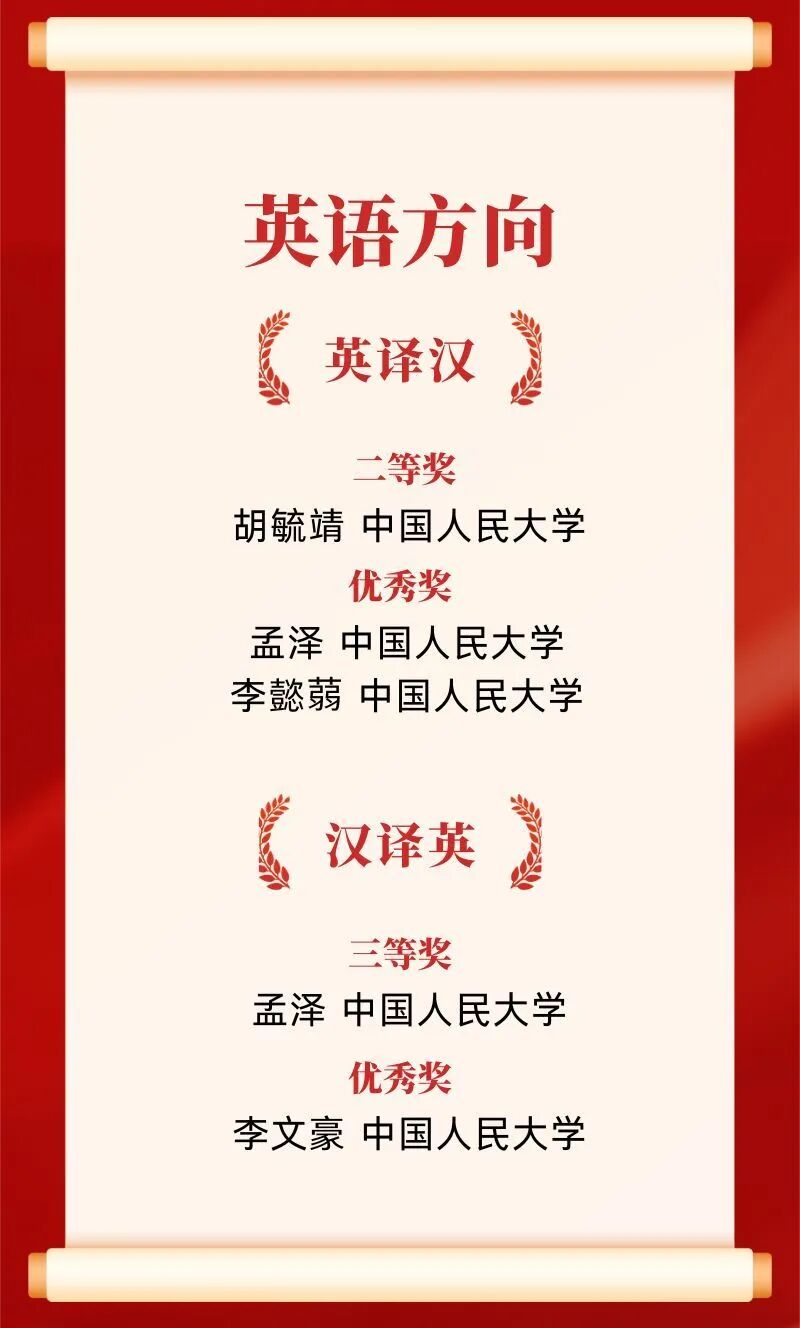 近日,第六届“中译国青杯”国际组织文件翻译大赛获奖名单正式公布。在这场高规格、高水平的专业较量中,我院一位2024级、三位2025级翻译硕士(MTI)专业学子凭借其扎实的专业功底、出色的双语转换能力以及对国际文本的深刻理解,从众多参赛者中脱颖而出,喜获多项大奖,充分展现了人大外院学子的卓越风采。其中,胡毓靖荣获英语组(英译汉)二等奖,孟泽荣获(汉译英)三等奖及英语组(英译汉)优秀奖,李懿蒻荣获英语组(英译汉)优秀奖,李文豪荣获英语组(汉译英)优秀奖。