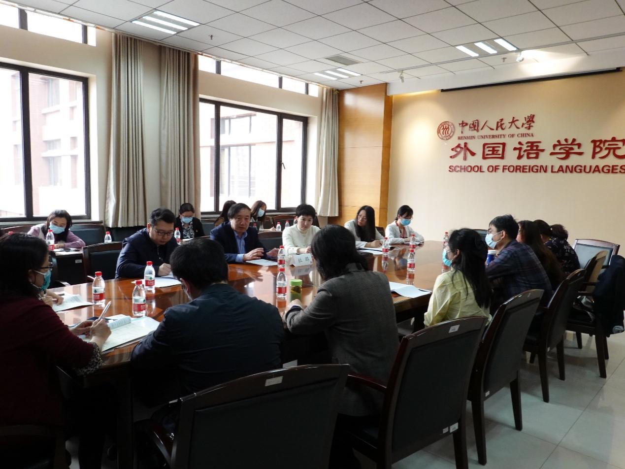 2022年4月21日上午10点,中国人民大学外国语学院在明德国际楼501举行“‘独树一帜’创一流——我为党代会建言献策”教师代表座谈会,请学院教师代表为学校学院的发展提出意见和建议。中国人民大学副校长杜鹏、学院党政领导班子成员以及各系部教师代表参与座谈。会议由党委副书记李佳伟主持。