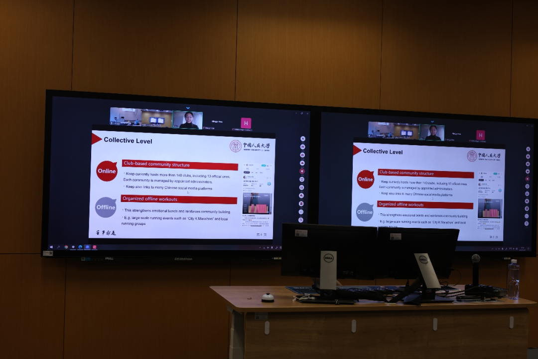来自中国人民大学外国语学院2023级本科生李之旭和2025级博士生邢博进行主题展示。李之旭以健身主题的手机应用KEEP为案例,从个体量化激励与集体社交机制双重视角,剖析了此类健身类应用在赋能用户健康管理的同时,也可能引发自我量化焦虑、数据依赖与社交攀比等潜在问题。邢博以“中国科技企业如何传递全球抱负”为题,系统分析了中国科技企业在国际化进程中,通过文化符号重构、本土市场适配等策略实现技术输出与价值传播的路径。
