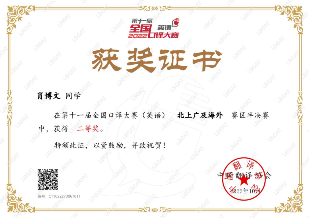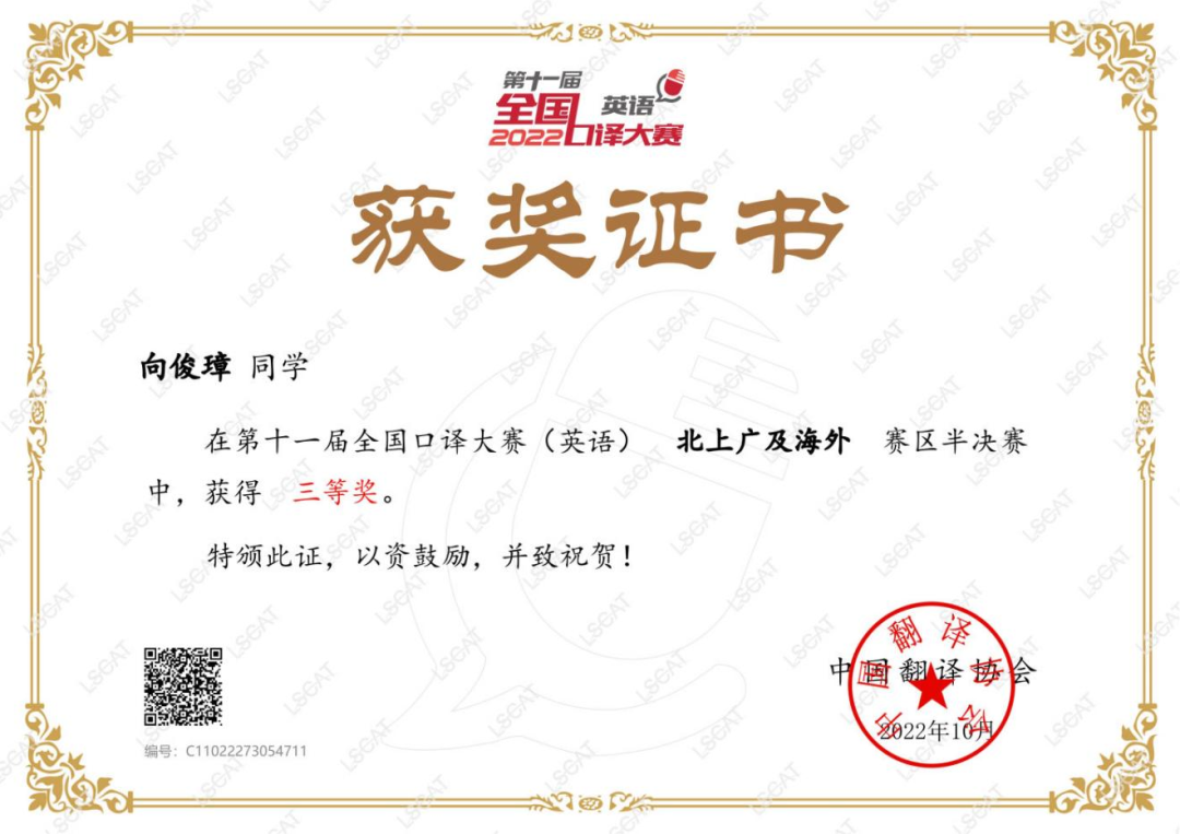 2020级英语语言文学硕士涂杰同学荣获一等奖,本科2019级国际新闻全英文实验班肖博文同学荣获二等奖,本科2019级英语系张夕同学与2021级MTI硕士向俊璋同学荣获三等奖。