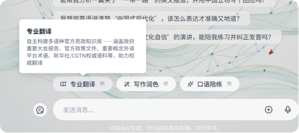 团队敏锐洞察到当前外语教学与思政教育存在割裂、高质量多语种中国话语资源稀缺、通用AI工具缺乏价值引导等现实痛点,创造性地提出“AI+新文科”解决方案,基于Coze平台打造了国内首个深度融合“外语学习”与“价值引领”的多语种AI智能体,运用RAG技术,系统整合涵盖中、英、法、西、阿、俄、日、德八大语种的官方报告、政策文件、权威外译等海量资源,建成体系化的中国话语知识库;设计九维全景训练模块,围绕“词、句、文、译、读、写、听、说、情”九个维度,提供全景式、交互式的语言训练与思政领悟场景,将价值塑造自然嵌入语言实践。在提供精准语言辅助的同时,智能体内嵌价值辨识与引导机制,并具备情感陪伴功能,可实现鼓励式反馈、个性化互动,致力于成为学习者融汇语言技能与家国情怀的“良师益友”。