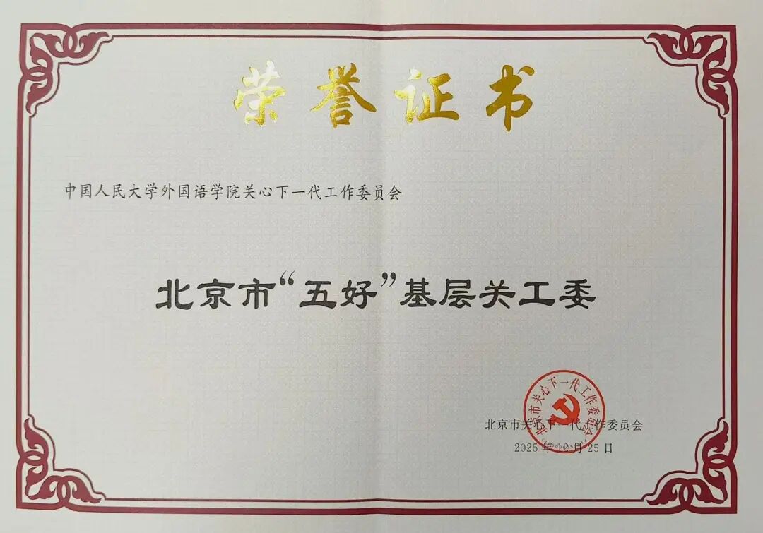 近日,北京教育系统关心下一代工作委员会印发《关于2025年北京市“五好”基层关工委认定情况的通报》,中国人民大学外国语学院关工委顺利通过市级审核认定,荣获2025年北京市“五好”基层关工委称号,标志着我院基层关工委标准化、规范化建设取得阶段性重大成果,学院关心下一代工作迈上新台阶。